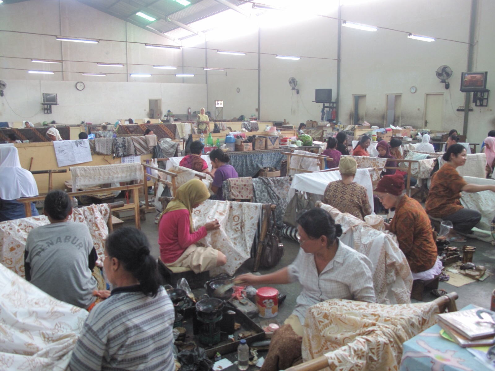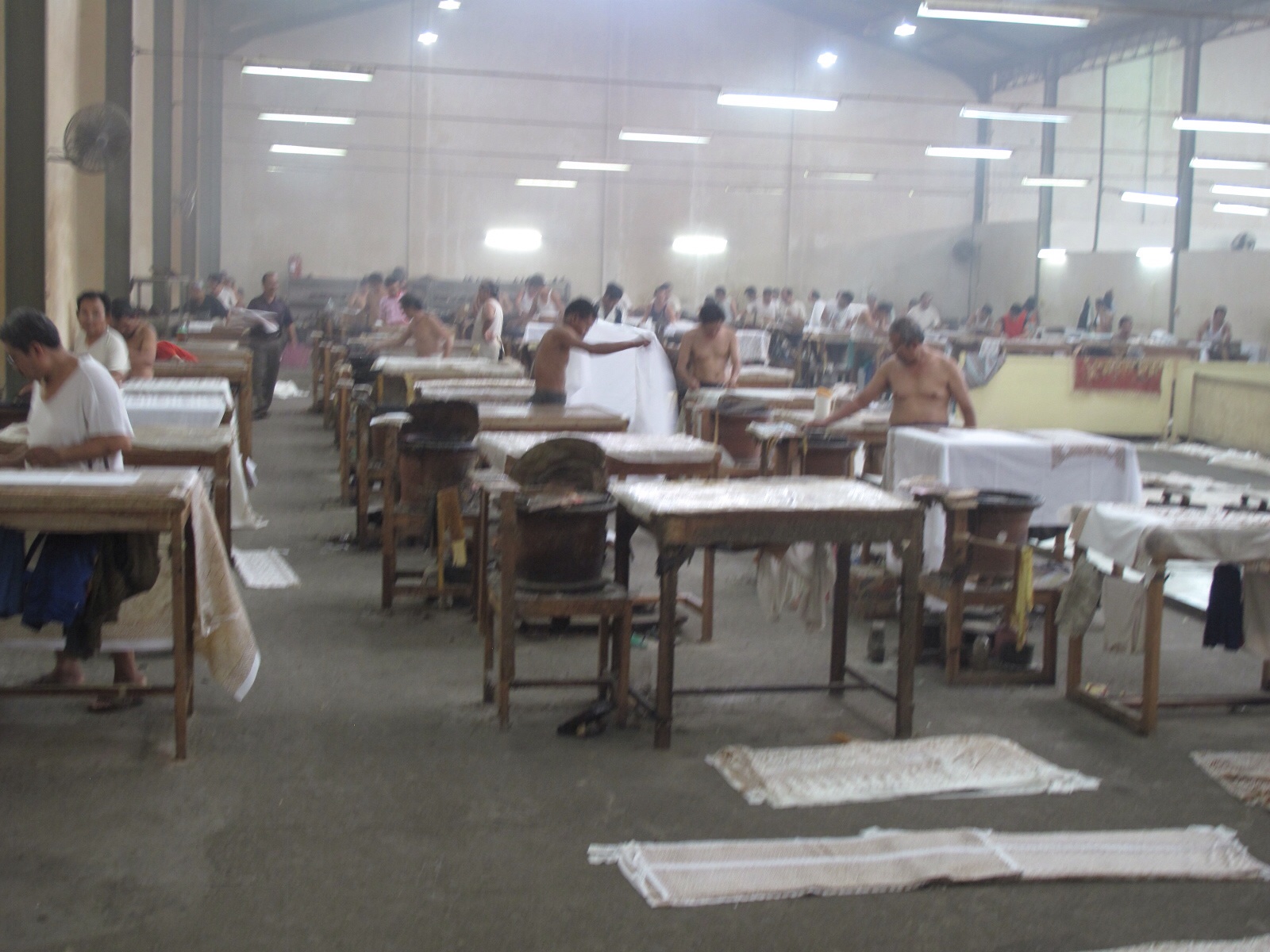 After the pleasant airy rooms of the batik collection, polished floors and exhibits beautifully presented, we were lead by the museum guide to the back of the building where batik is made in the ” factory ” on a massive scale.
