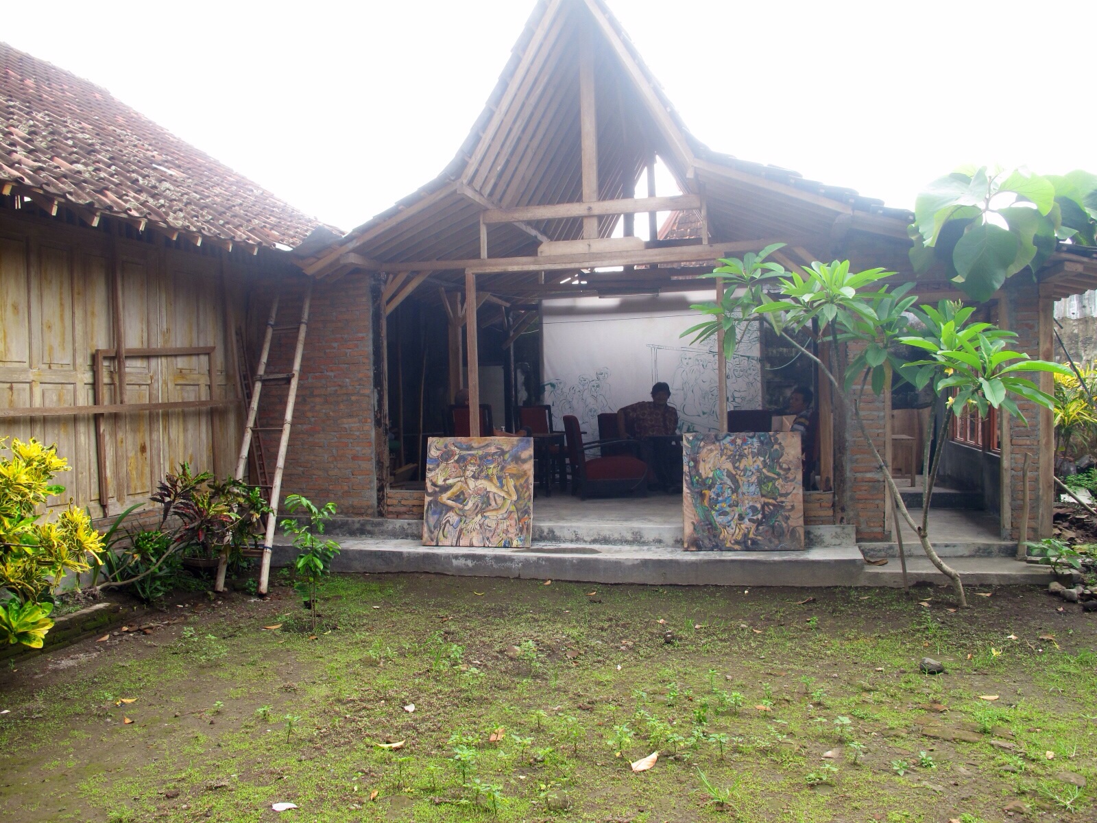His studio was a lush garden surrounded by open out buildings, opposite his beautiful, original old Javenese style home. He also had a large wooden barn like building where he stored his many oil and acrylic paintings.