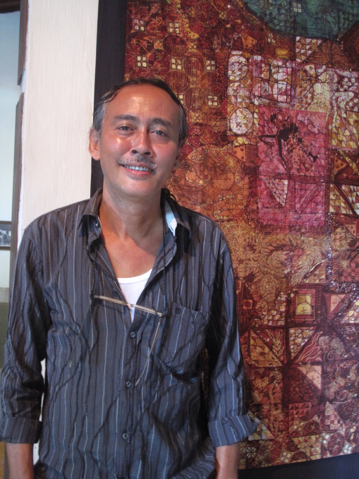 Agus was much warmer and easier to talk to than I’d expected, I met him in his Gallery and studio, after taking a taxi there. He was a little late but it gave me time to look around and see the batiks before our discussion. The work was ethereal and delicately beautiful, each one telling a story and imbued with meaning.