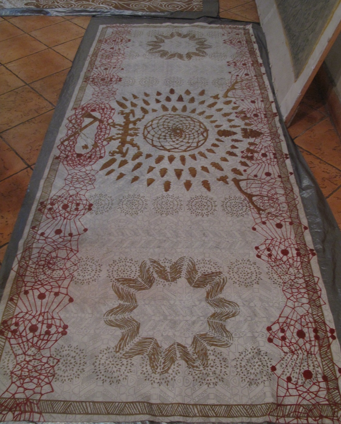 Agus uses many traditional batik motifs in his work which attach their traditional meaning to his own philosophy. He described the work in depth giving me insight to the collaborative processes of the various cultures they have worked with, for instance, “Seven Sisters ” the Aboriginal story of the crippled sisters who had to run away from the wild man, they hide in a cave, turn into birds and fly up to the heavens and become stars. This batik had lots of foot prints on it symbolising their journey also Javanese batik motifs, Parang ( meaning knife or fire) and Kuwang, ( four directions, positive and negative
