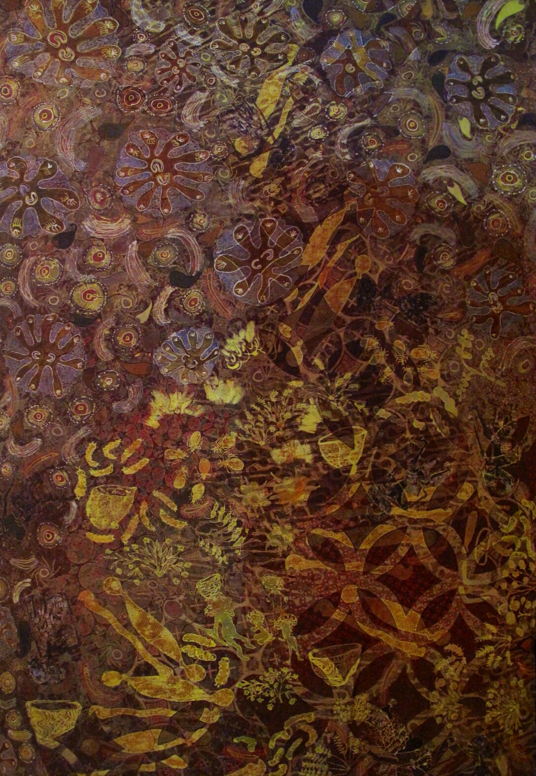 Agus disclosed that he isn’t comfortable with the word , ” contemporary ” when used to describe his work. He said that That “Contemporary puts his work into the “art market place” and drains away some of the sensitivity of meaning and spiritualism that he is so passionate about. He believes that his work is without concept, it is his creativity connecting with the Earth and nature and expressing through his strong batik heritage. He sees tradition as ongoing and changing, his work reaches back but moves forward too in his collaborations around the world. He said people talk about batik as a “resist” technique, which he doesn’t like, he said it is about “absorption”,( a word he used many times). ” You absorb the Spirit, the earth and it is then absorbed into the work. Batik is about absorption not resistance “. I suggested that “resist” was maybe a negative word, he totally agreed. I could see myself becoming totally absorbed by his very compelling ideology !