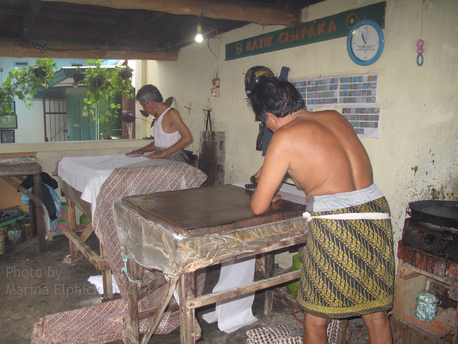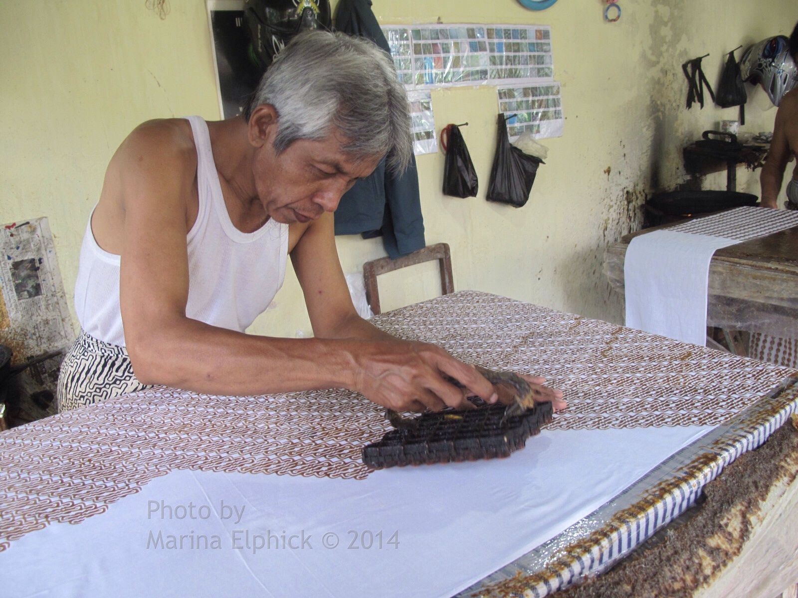 Batik by Bambang Darmo, an artist I visitedBambang Darmo in his gardenTatang and Mrs Arminah with their collaborative batik in progressMrs Aminah’s house and workroomMrs Yati working so perfectly with a cantingMufidah dyeing her batik in natural red Mahogany dyeMufidah with her work ready for next dyeBatik sarong by MufidahMrs Poniyem dyeing Aprat Koeswadji’s batik in his studio/ dye areaMen working with caps in a Solo workshopThe cap design is carefully matched and printed, there is no room for errorThe cap pattern is repeated right to the very edgesLate 19th century North Coast Javanese batik in the Danar Hadi museumNorth Coast Javanese batik, Danar Hadi museumWomen working in the Danar Hadi factory, a compellingly fascinating place to see, but resembling the working conditions of Earlier timesA man carefully uses a wax paper mask to create a curved edge to his cap printing, Danar Hadi batik factorySmall paper masks have prevented the background cap design from covering the flowers.Close up view of woman’s canting work, Danar Hadi batik factoryThe dye room at Danar Hadi factoryDye room with workers rinsing the completed batikThe huge rinsing baths at Danar Hadi Batik factoryLadies at work, Danar Hadi factoryWaxed, un-dyed batik just waiting for that dye bath that will bring it to life !Detail of a batik by Slamet RiyantoBatik by Slamet RiyantoBatik by Slamet RiyantoTatang at his gallery, Leksa GaneshaBatik by Tatang Elmy WibowoBatik by Agus Ismoyo and Nia Fliam