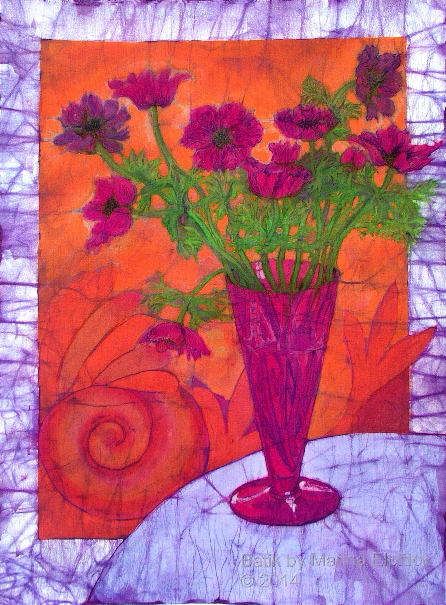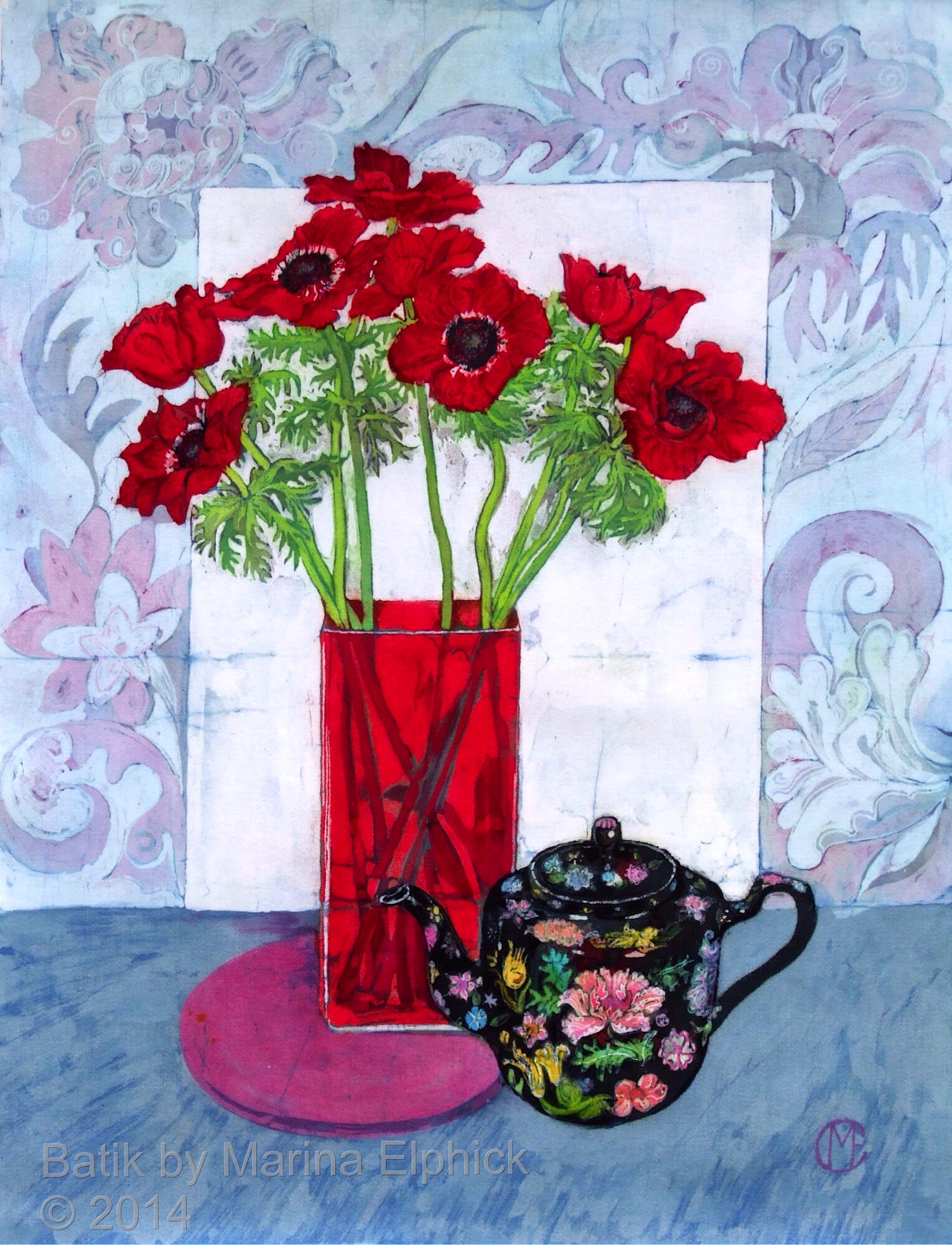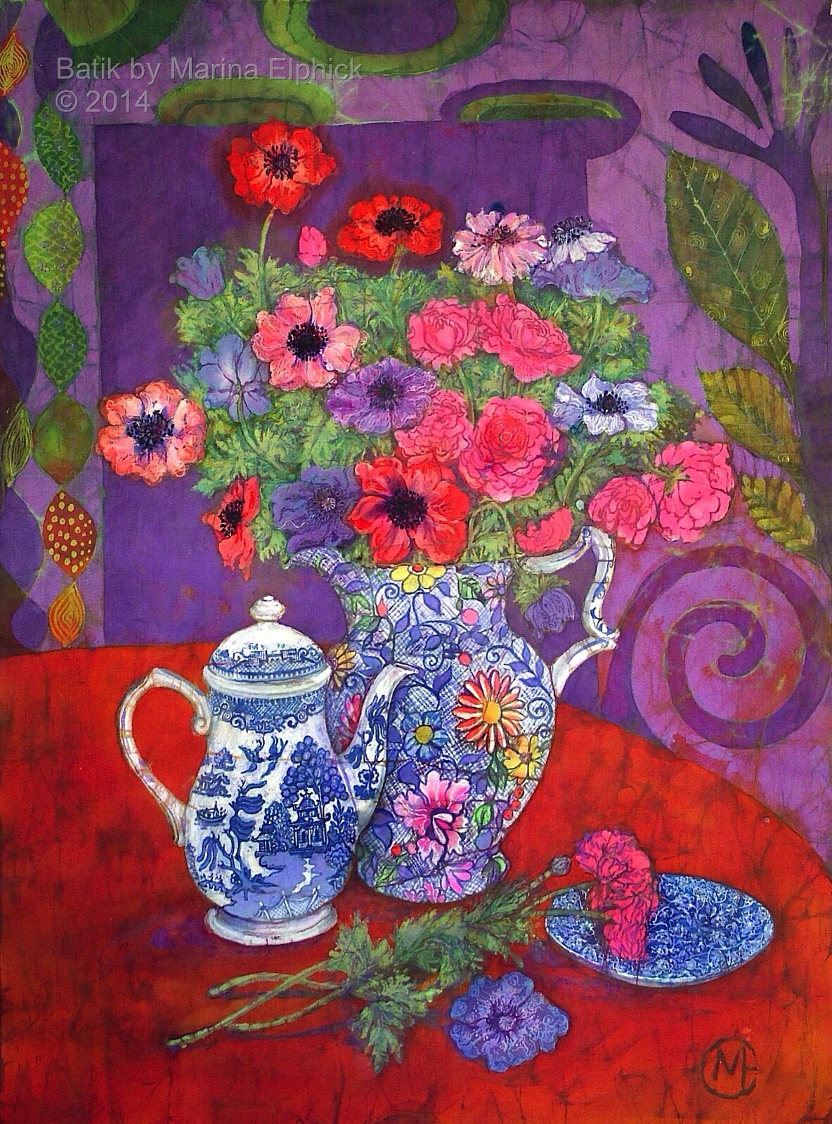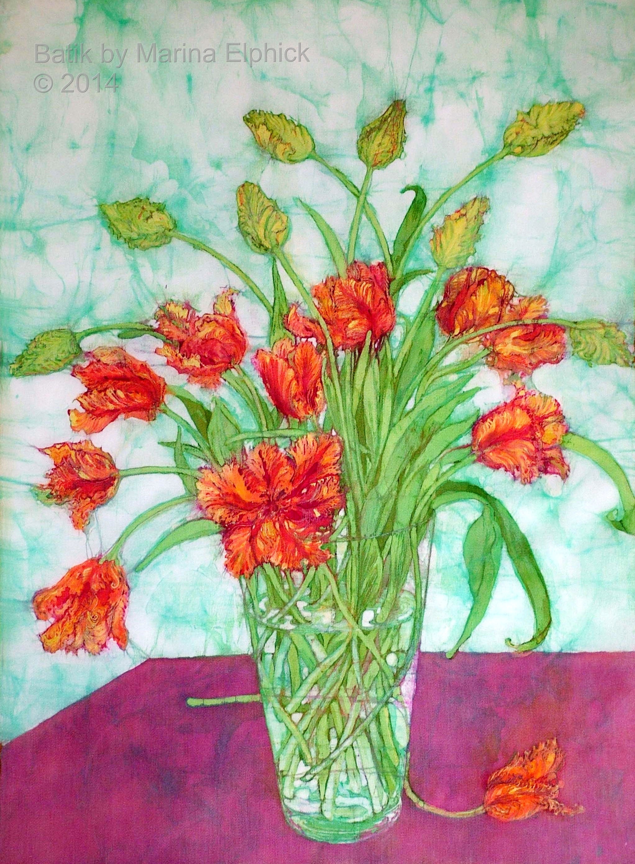 Rose hips, detail from Autumn, a batik by Marina Elphick.Detail of roses from a batik portrait by Marina Elphick.Snow drops, detail from batik portrait of Amanda and Lucy, by Marina Elphick.Blossom and cyclamen, detail from a batik portrait of Amanda and Lucy.Rose detail from a batik portrait, by Marina Elphick.Poppies and seed heads, detail of batik portrait by Marina.Detail of poppy and chrysanthemums, from a Portrait of Nicole. Batik by Marina Elphick.Lanterns and blackberries , detail from Autumn. Batik art by Marina Elphick.Cosmos, daisies and roses, detail from portrait of Bobby, batik .Flower detail from ” Butterfly on blue “, batik art work by Marina Elphick.Anemones with Chinese screen, batik art work by Marina Elphick.Detail of Iris’ from batik portrait on paper, by Marina Elphick.Lupins, from a batik portrait by Marina Elphick.Lilies and Poppy seed heads, batik art by Marina Elphick.Bird of paradise, early floral batik by Marina Elphick.Cornflowers in Blue glass vase, batik by Marina Elphick.Anemones and black teapot, batik by Marina Elphick.Poppy Garden 1, batik by Marina Elphick.Poppy Garden 2, batik art work by Marina Elphick.Cerise anemones, batik art work by Marina Elphick.Fire tulips, batik by Marina Elphick.Purple Tulips in green vase, batik by Marina Elphick.Sweet peas on the Window sill, batik by Marina Elphick.Ranunculus on blue, batik by Marina Elphick.Purple Ranunculus, batik by Marina Elphick.Red Tulips, batik art work by Marina Elphick.Anemones with Phoenix screen, batik art by Marina Elphick.White Cat and Anemones, batik by Marina Elphick.