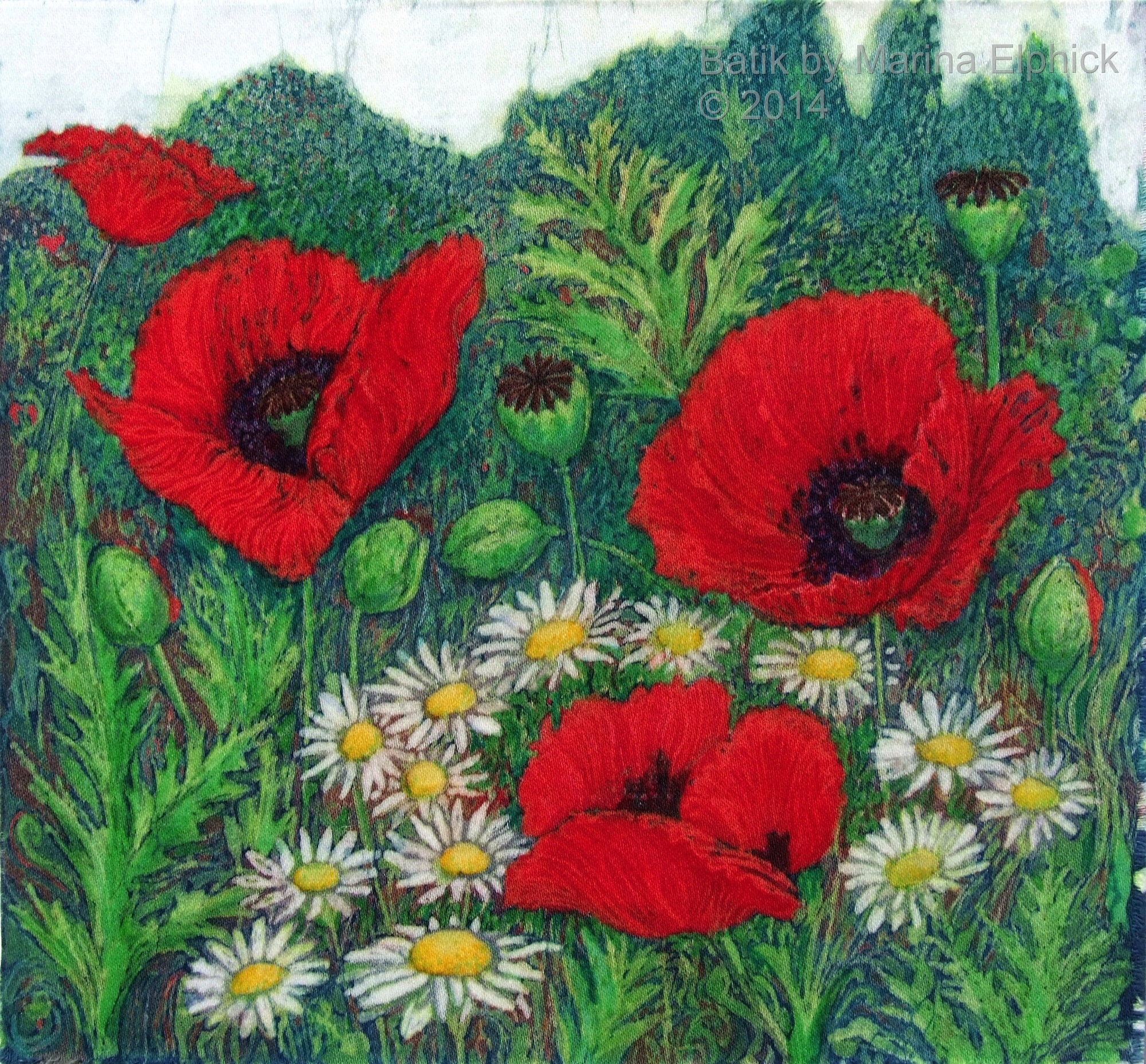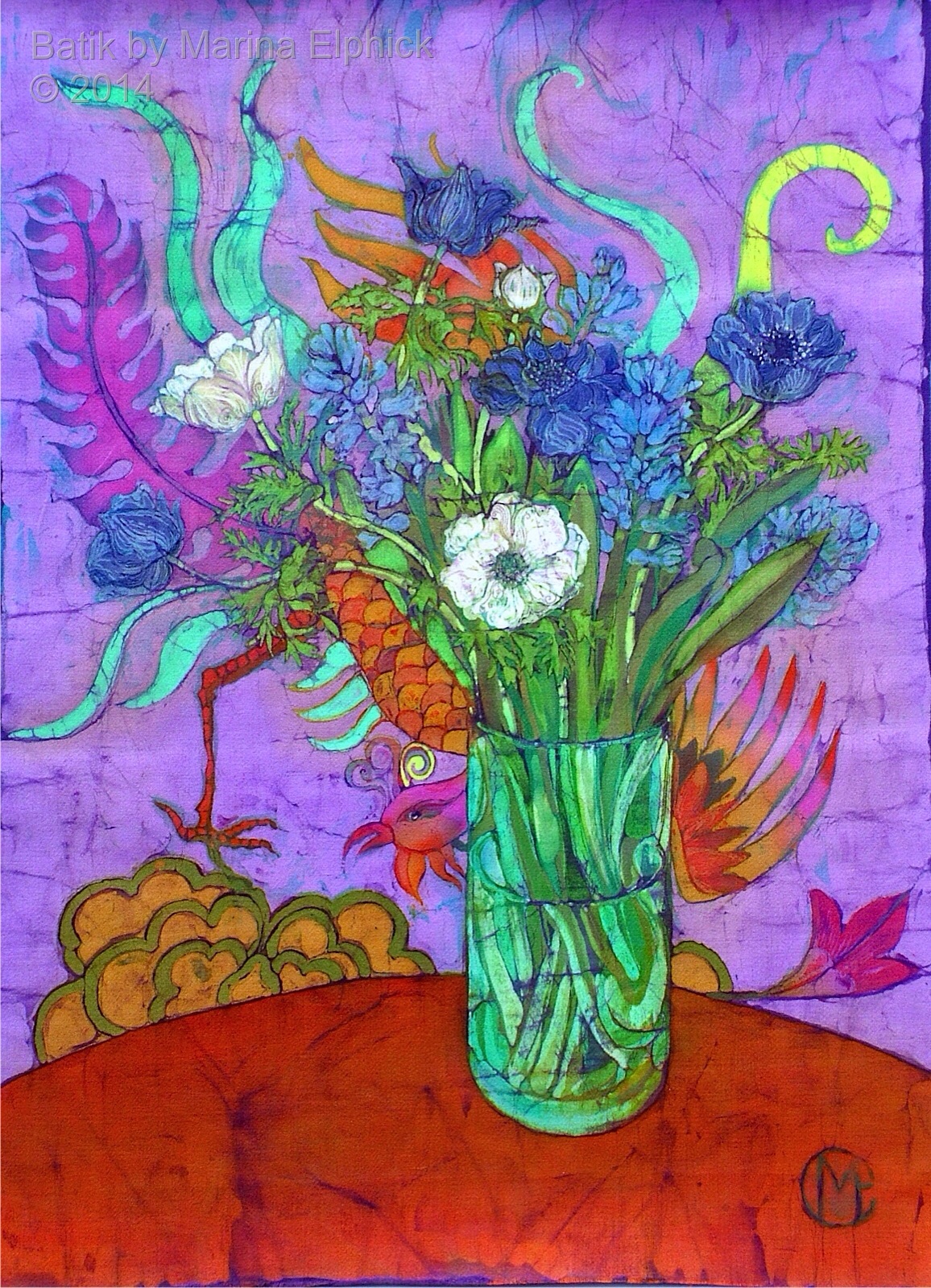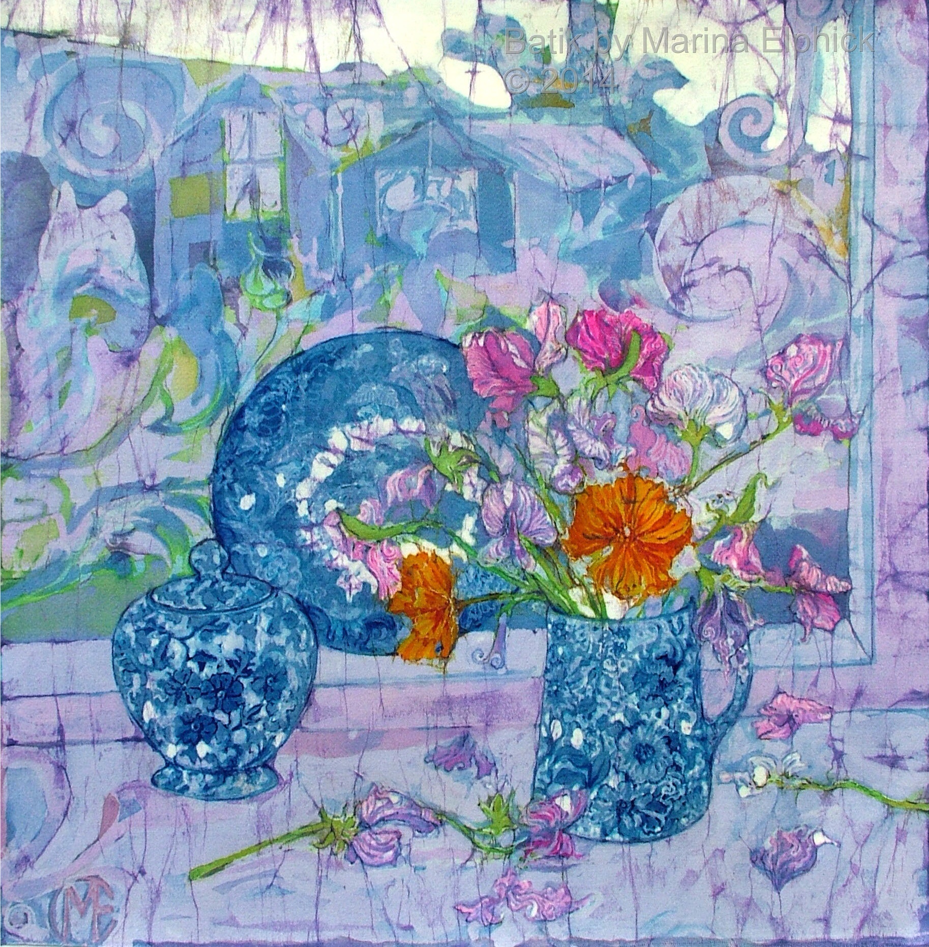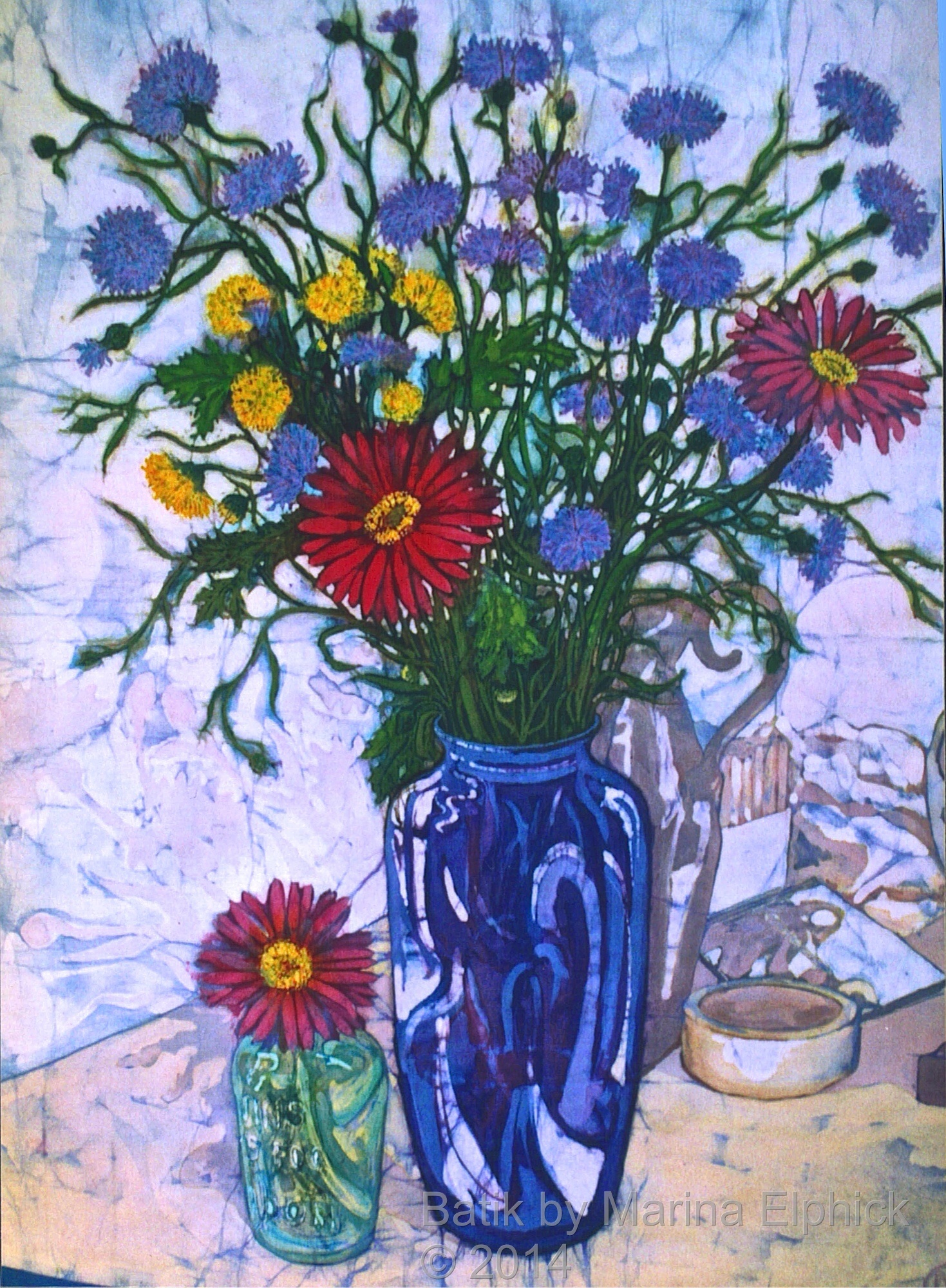 Rose hips, detail from Autumn, a batik by Marina Elphick.Detail of roses from a batik portrait by Marina Elphick.Snow drops, detail from batik portrait of Amanda and Lucy, by Marina Elphick.Blossom and cyclamen, detail from a batik portrait of Amanda and Lucy.Rose detail from a batik portrait, by Marina Elphick.Poppies and seed heads, detail of batik portrait by Marina.Detail of poppy and chrysanthemums, from a Portrait of Nicole. Batik by Marina Elphick.Lanterns and blackberries , detail from Autumn. Batik art by Marina Elphick.Cosmos, daisies and roses, detail from portrait of Bobby, batik .Flower detail from ” Butterfly on blue “, batik art work by Marina Elphick.Anemones with Chinese screen, batik art work by Marina Elphick.Detail of Iris’ from batik portrait on paper, by Marina Elphick.Lupins, from a batik portrait by Marina Elphick.Lilies and Poppy seed heads, batik art by Marina Elphick.Bird of paradise, early floral batik by Marina Elphick.Cornflowers in Blue glass vase, batik by Marina Elphick.Anemones and black teapot, batik by Marina Elphick.Poppy Garden 1, batik by Marina Elphick.Poppy Garden 2, batik art work by Marina Elphick.Cerise anemones, batik art work by Marina Elphick.Fire tulips, batik by Marina Elphick.Purple Tulips in green vase, batik by Marina Elphick.Sweet peas on the Window sill, batik by Marina Elphick.Ranunculus on blue, batik by Marina Elphick.Purple Ranunculus, batik by Marina Elphick.Red Tulips, batik art work by Marina Elphick.Anemones with Phoenix screen, batik art by Marina Elphick.White Cat and Anemones, batik by Marina Elphick.