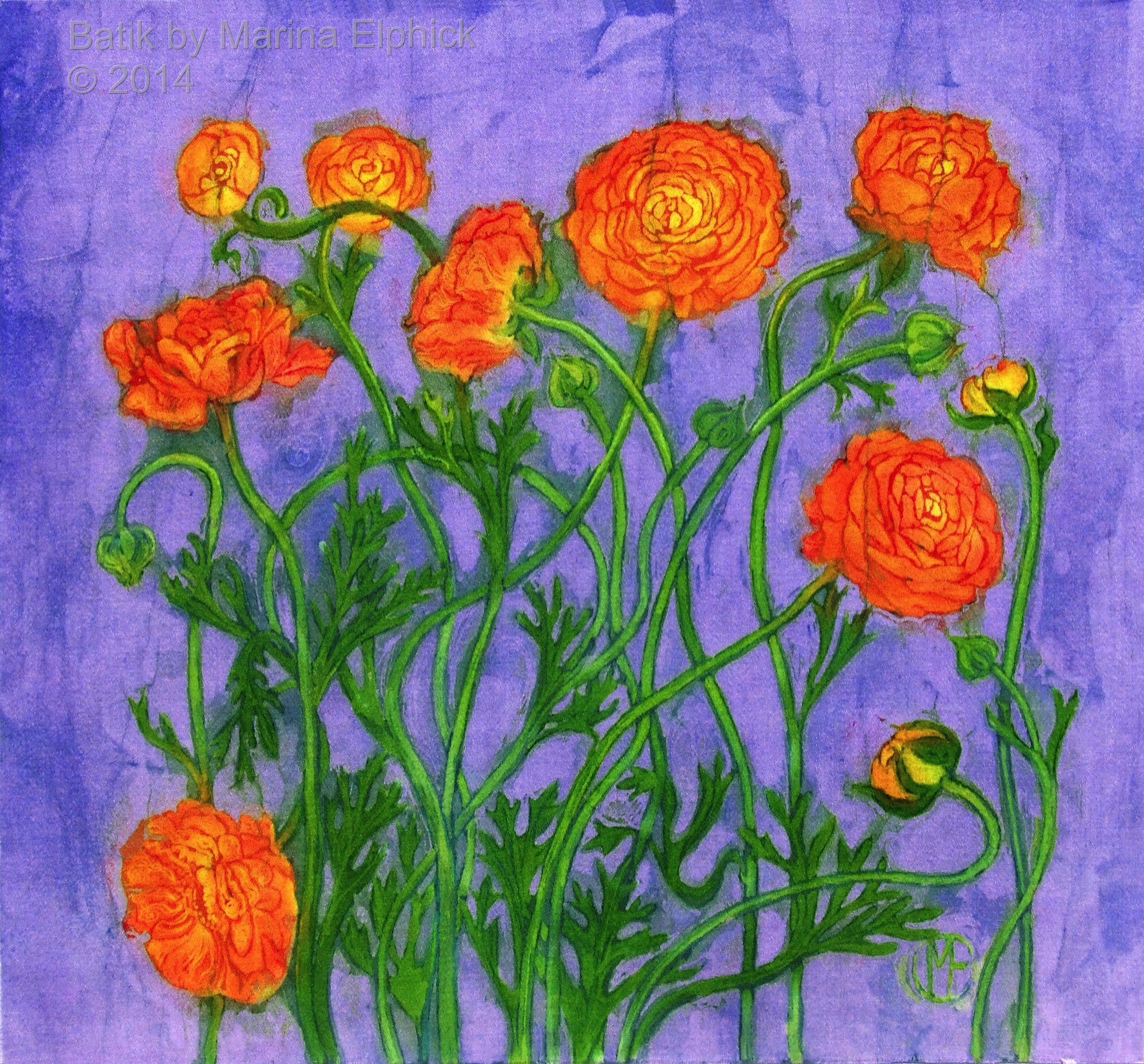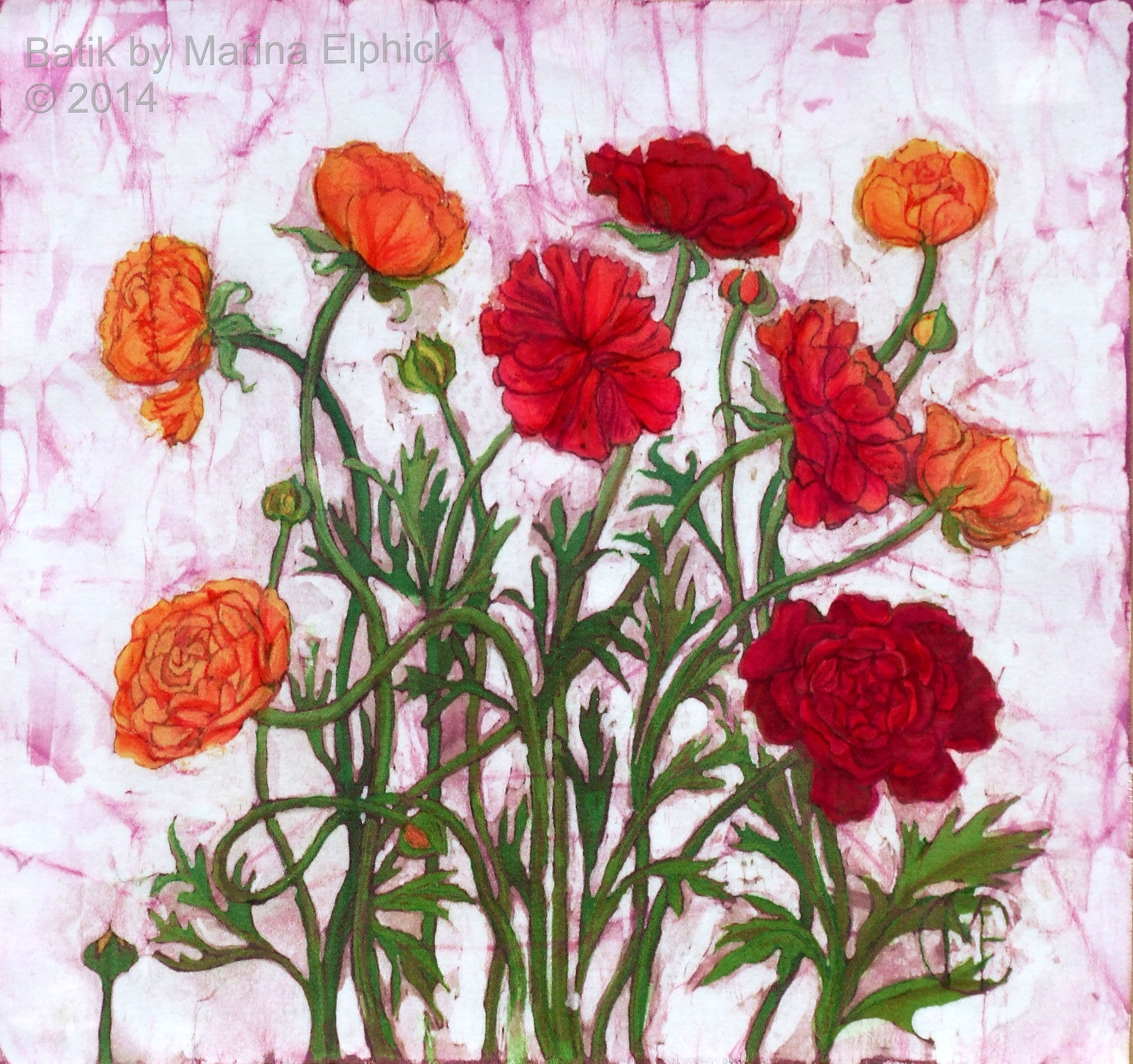 Ranunculus in shades of red to orange, floral batik on cotton by Marina Elphick.