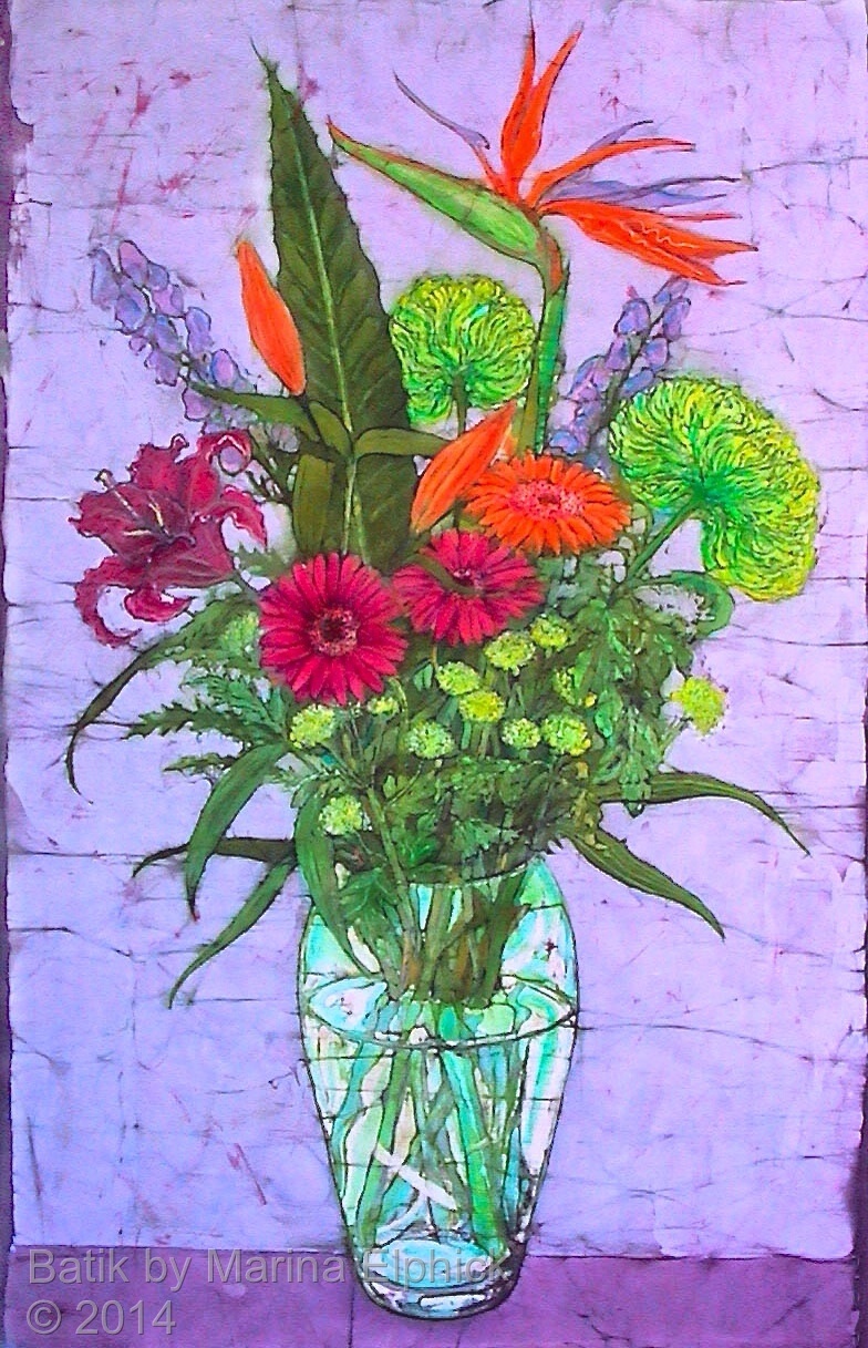Lilies and Iris on Orange, batik art work by Marina Elphick.Anemones in blue and white vase, floral batik art work by Marina Elphick.Lilies and Iris in hand made vase, floral batik art work on cotton.Freesias, batik by Marina Elphick.