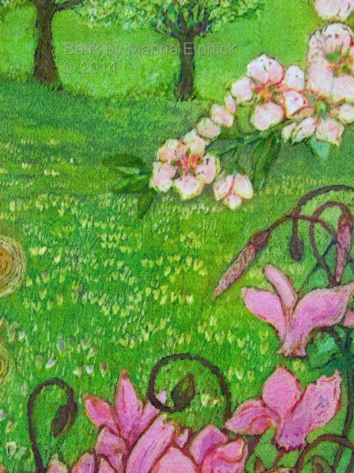 Cyclamen and ivy, detail from Winter, batik by Marina Elphick. Flowers in art.