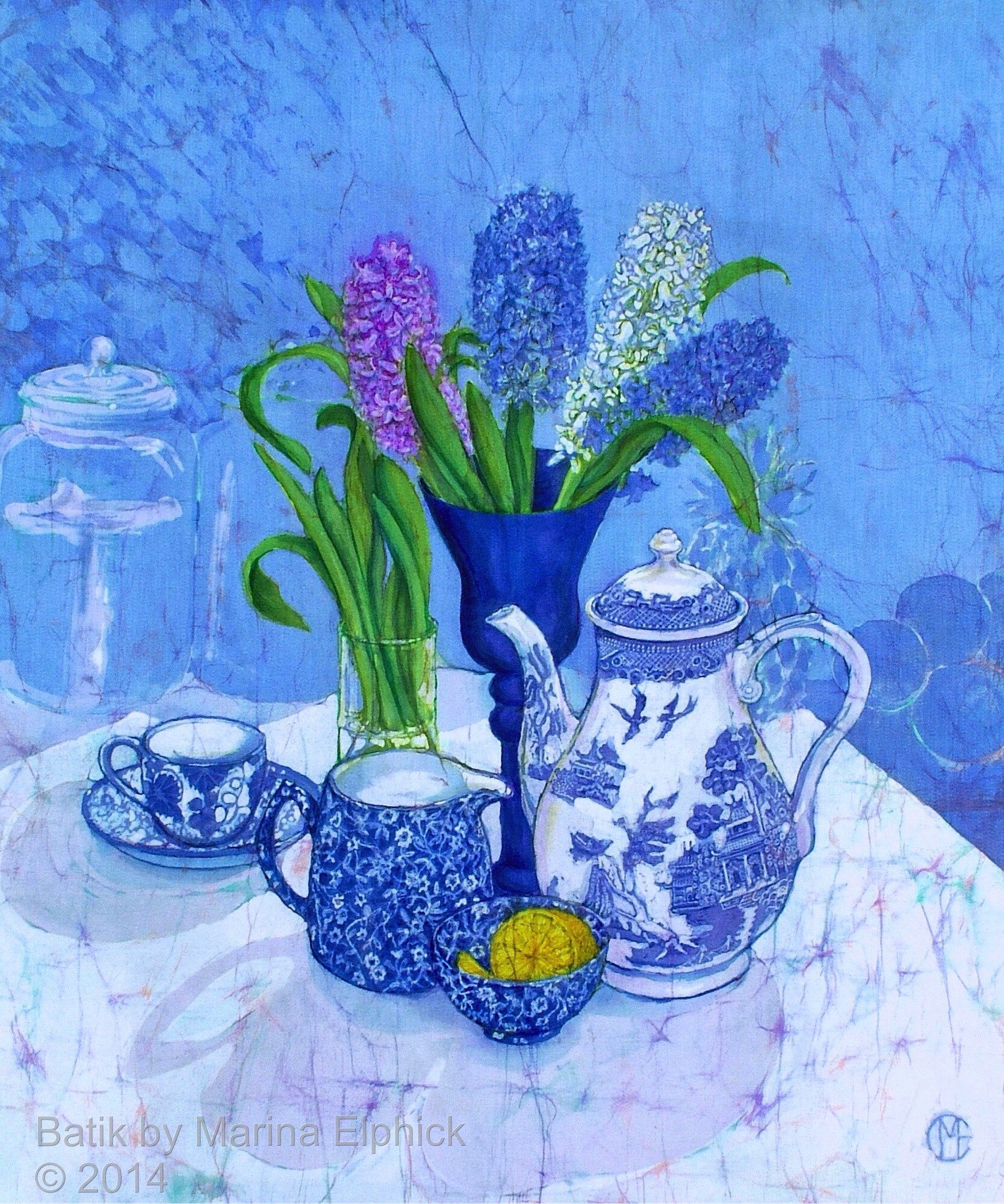 Exotic Bouquet in home made vase, batik art work by Marina Elphick.Hyacinths with Willow Coffee pot, batik art by Marina Elphick.