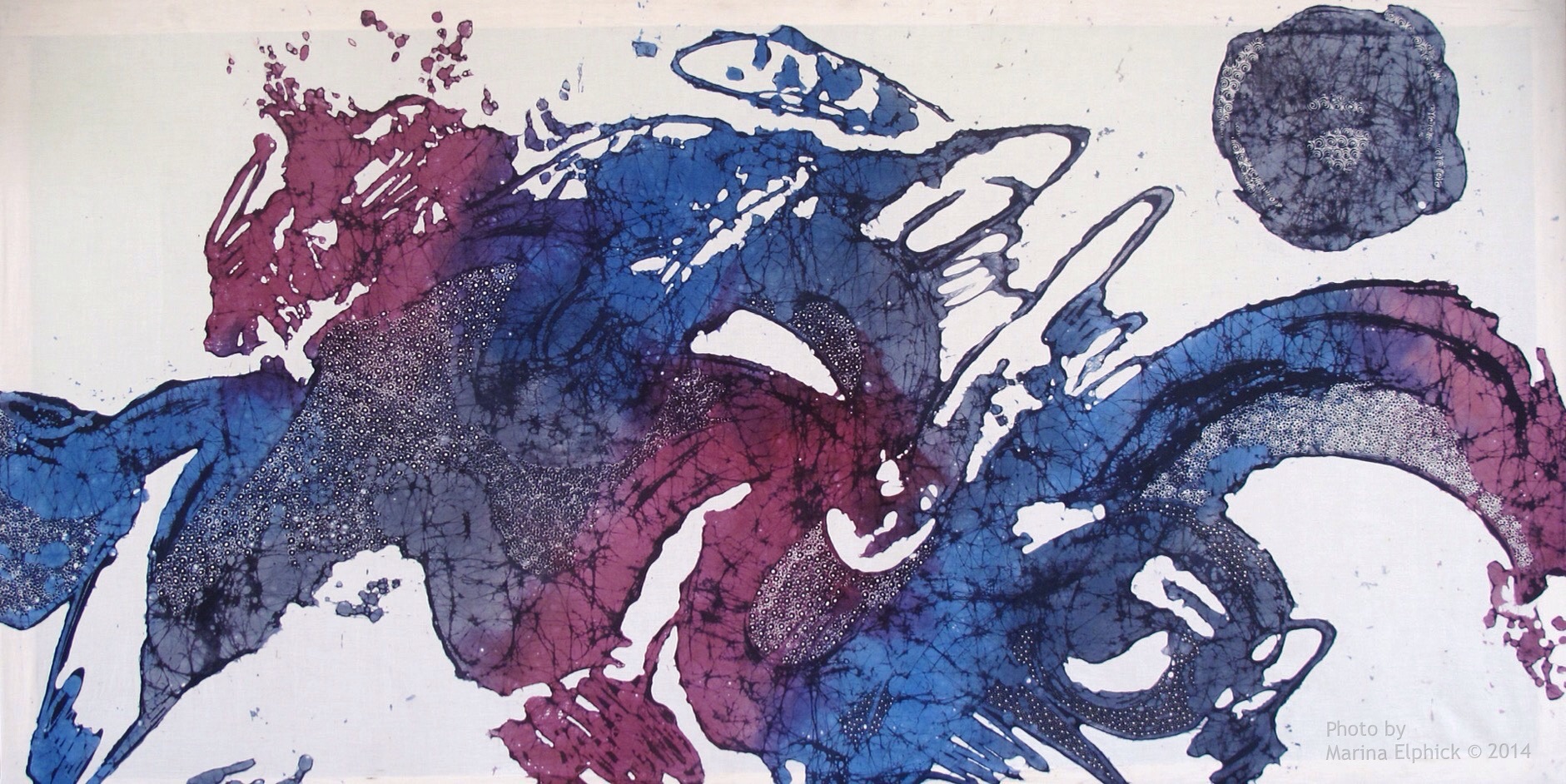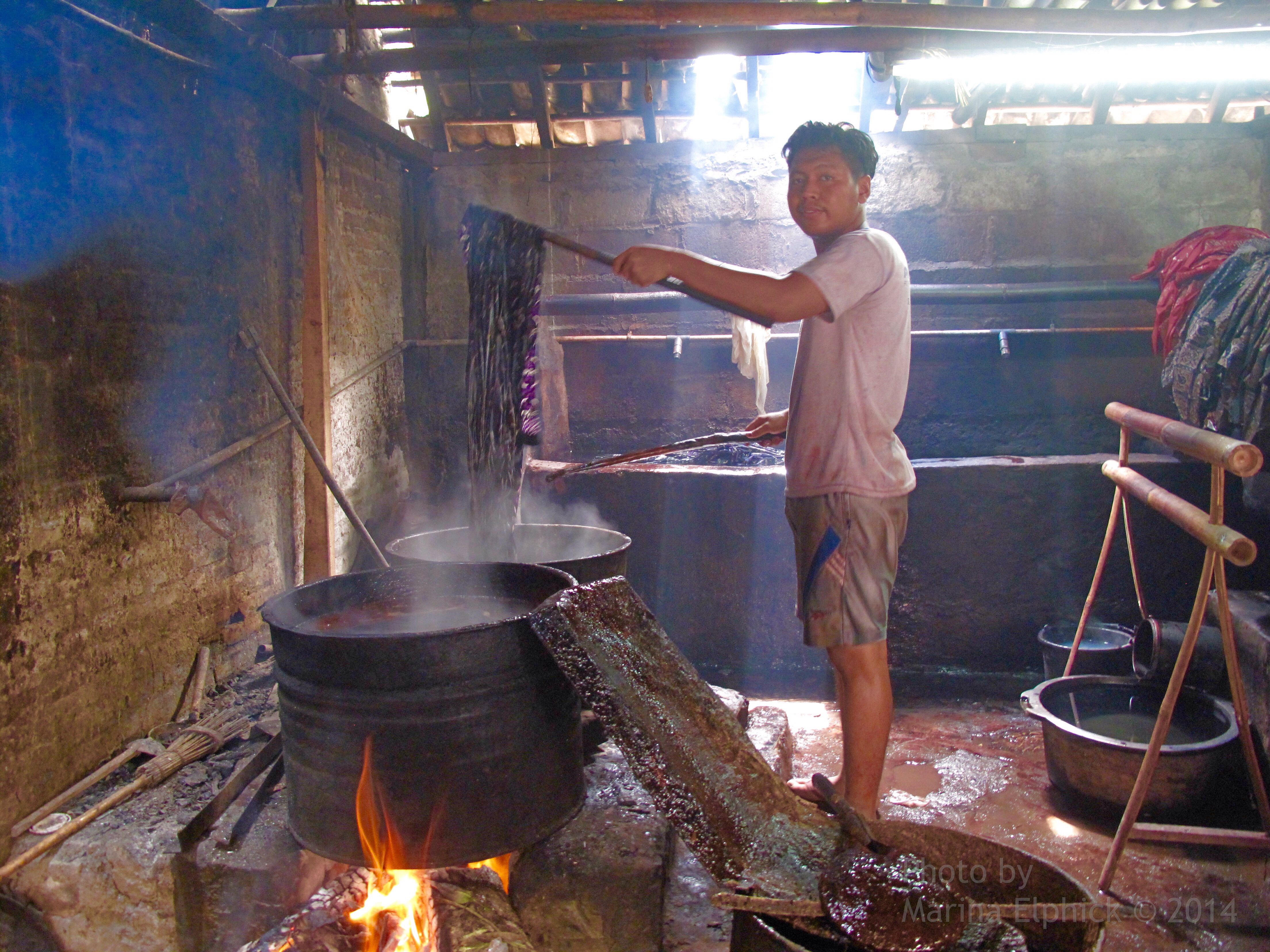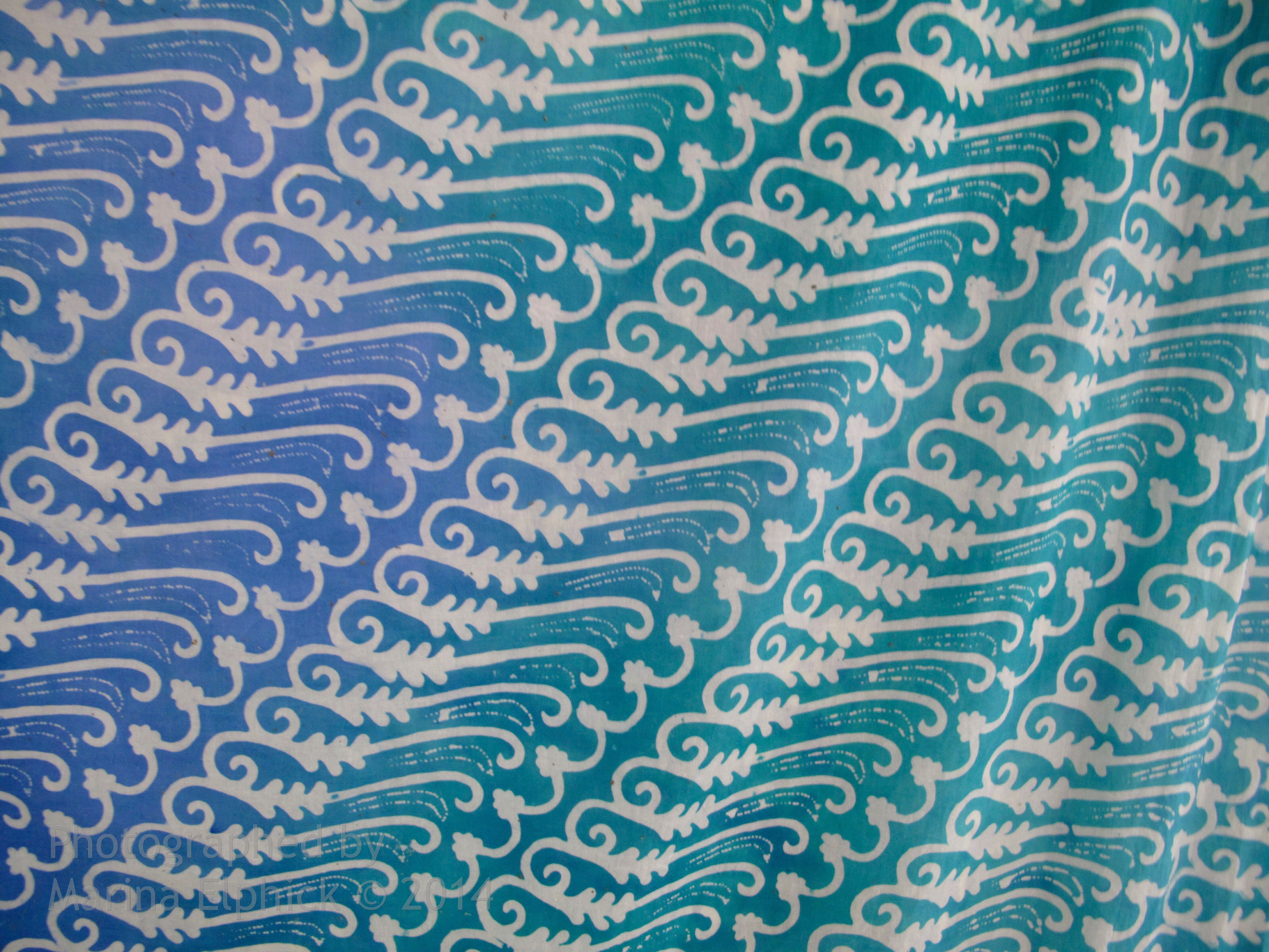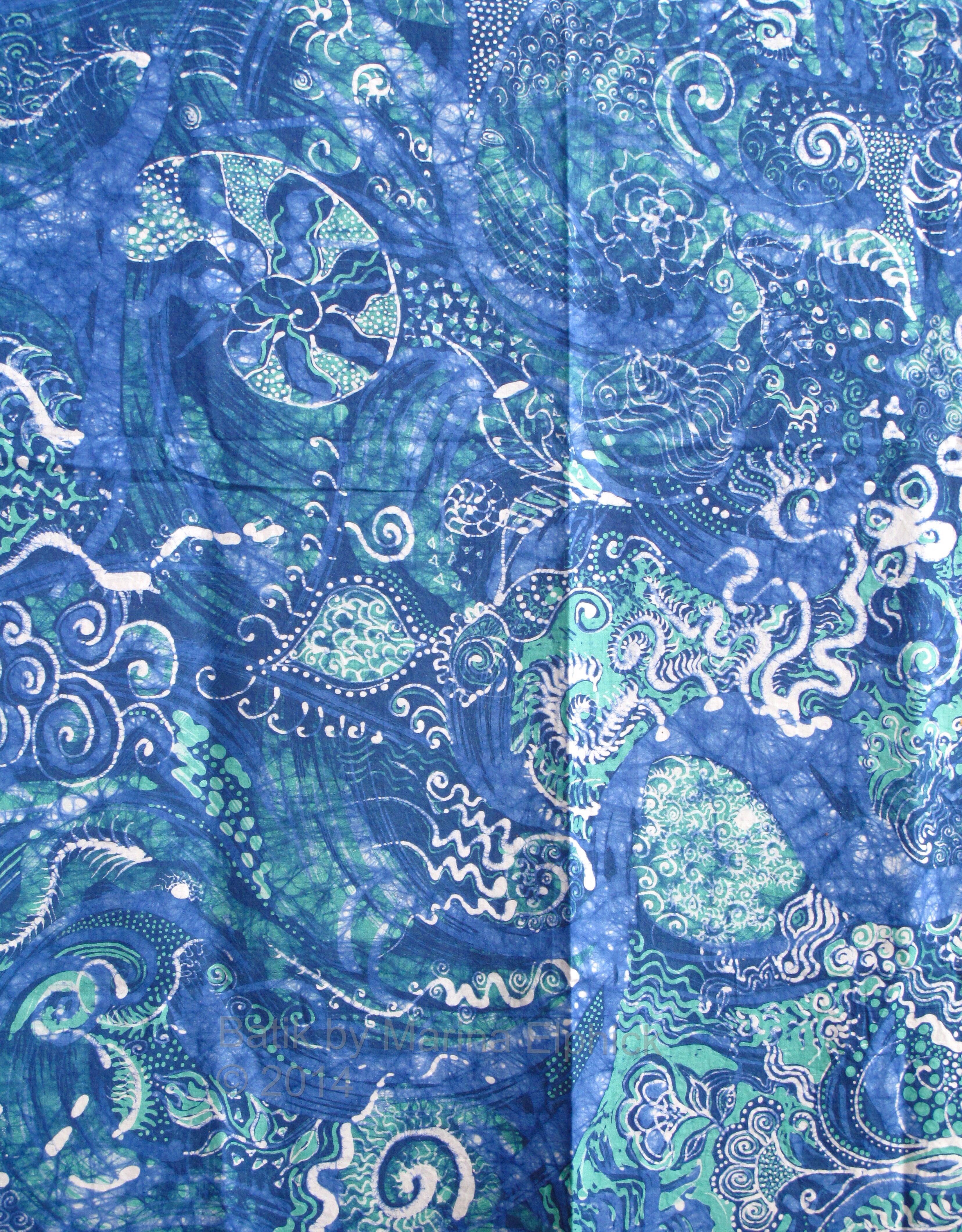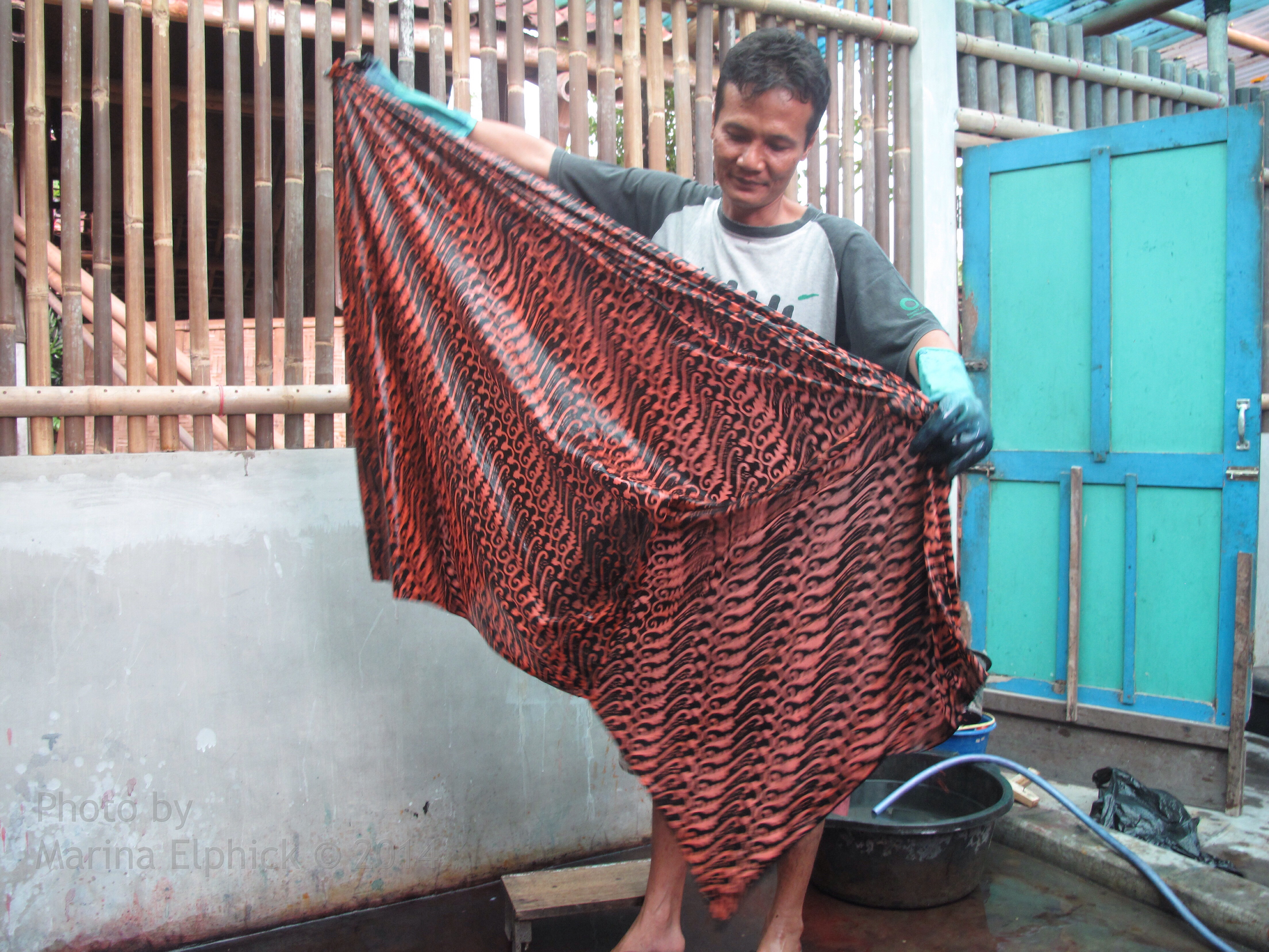I was able to complete my batik in time, dyeing it with green and blue Naphthol dyes, with the help of Tatang, who did all the chemical work for me. Naphthol dyes are banned in Europe, UK and the USA because of their toxicity and danger to the environment. It is a shame we don’t have a safe version of, or similar dye to Naphthol because of their instant colourfastness and ability to be boiled without losing any colour depth. As soon as my batik had its final blue dye, still wet, it was dipped into a pot of boiling water to remove the wax, all done in 5 minutes ! It would have taken me at least a day of ironing through newspaper at home with my Procion cold water dyes, and wax residue would still remain.