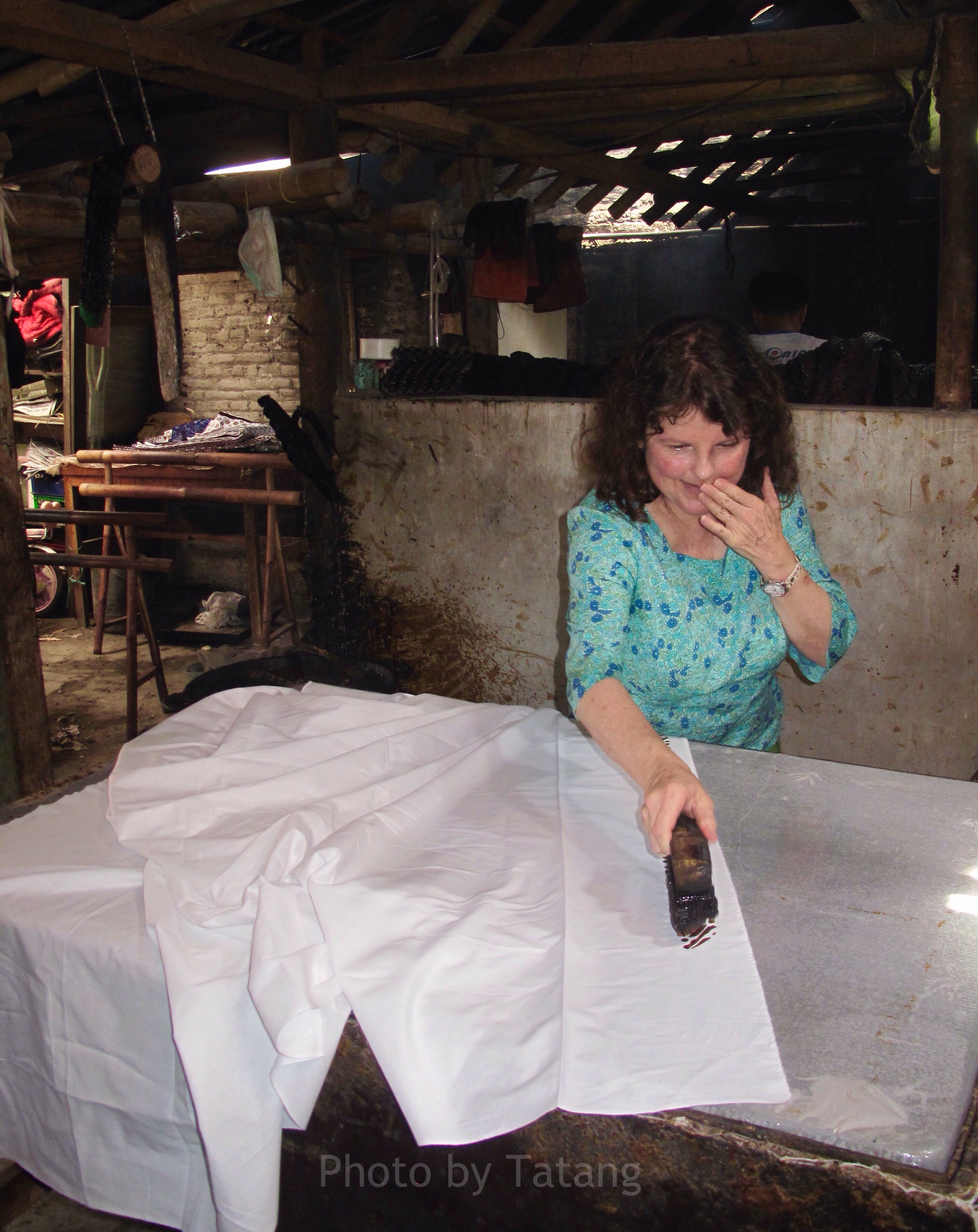 I spent two days with some ladies working on my own batik at Tatang’s workshop, it was a real privilege. Sitting on a small stool all day was challenging enough, but to keep a steady and constant hand while applying wax to draped, un taut cotton was very difficult ! Batiking the traditional Javanese way is all together different and much more demanding than our contemporary methods in the UK. It’s about precision and accuracy, calm application with an even flow of wax and no drips allowed.