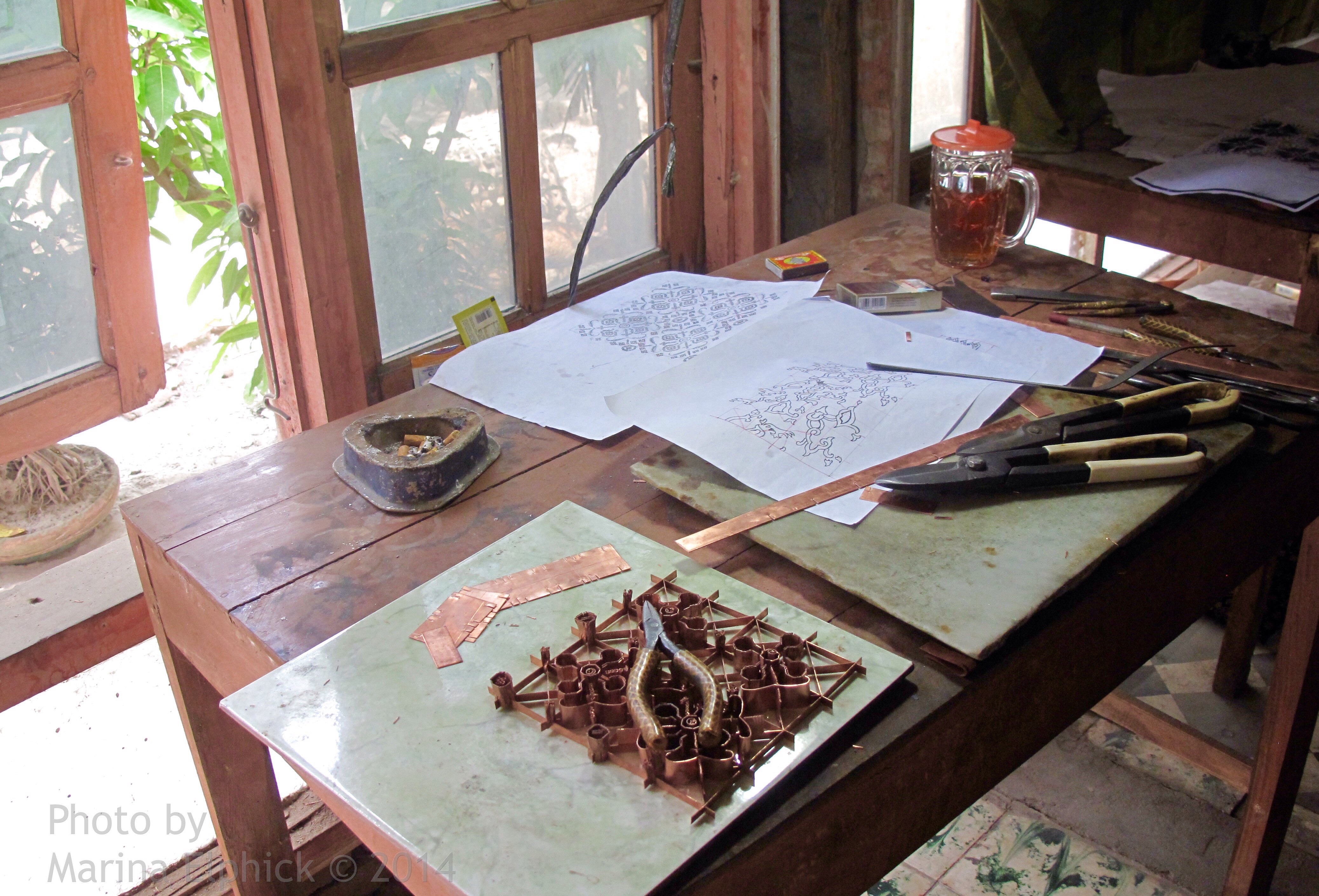 We visited a cap making workshop and saw the lengthy and skilful process of cap construction, where copper strips are carefully bent into shapes and soldiered onto a framework, creating intricate patterns to print hot wax onto cotton. This home industry was hidden in a small village, down a back lane, a place we would never have found alone.