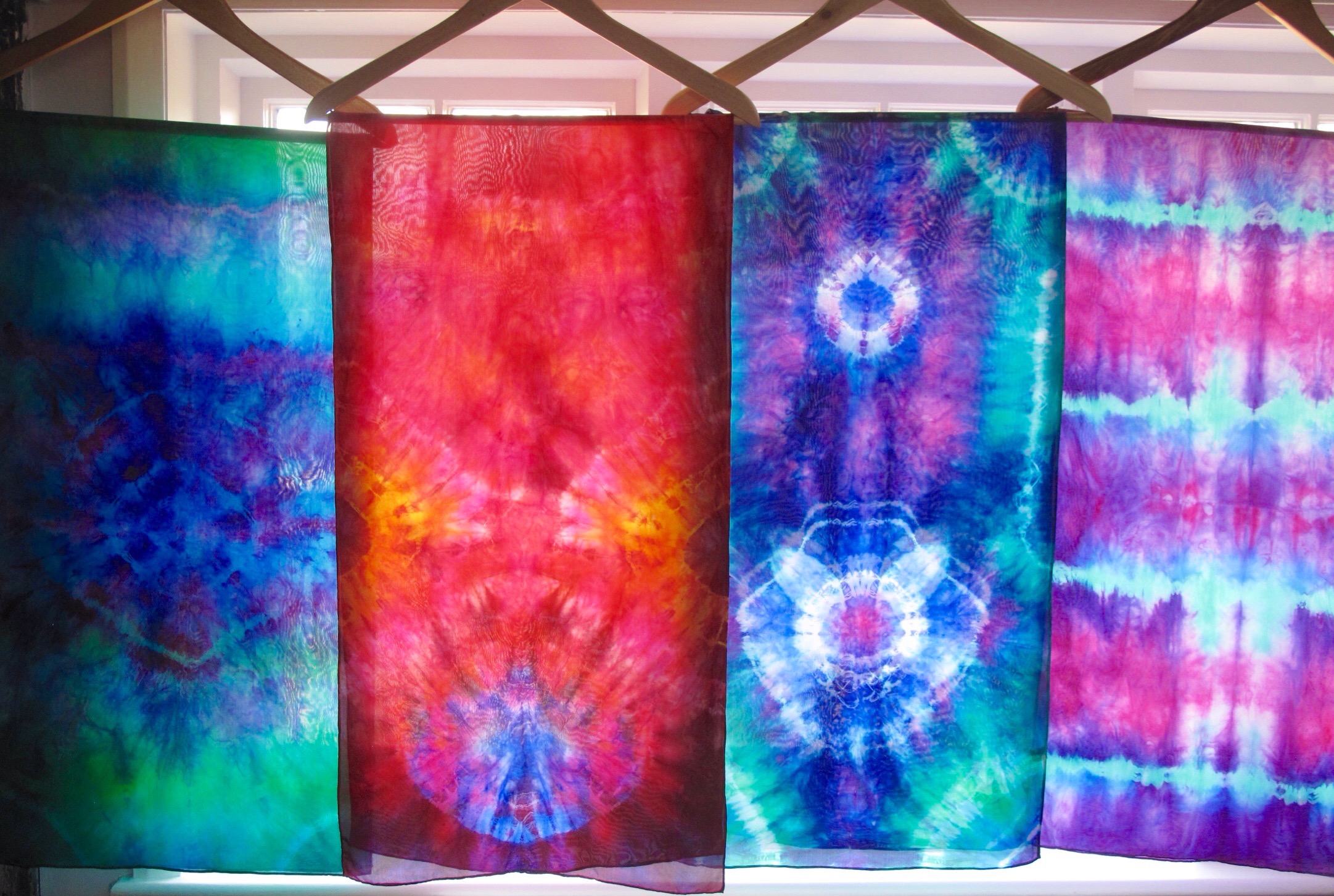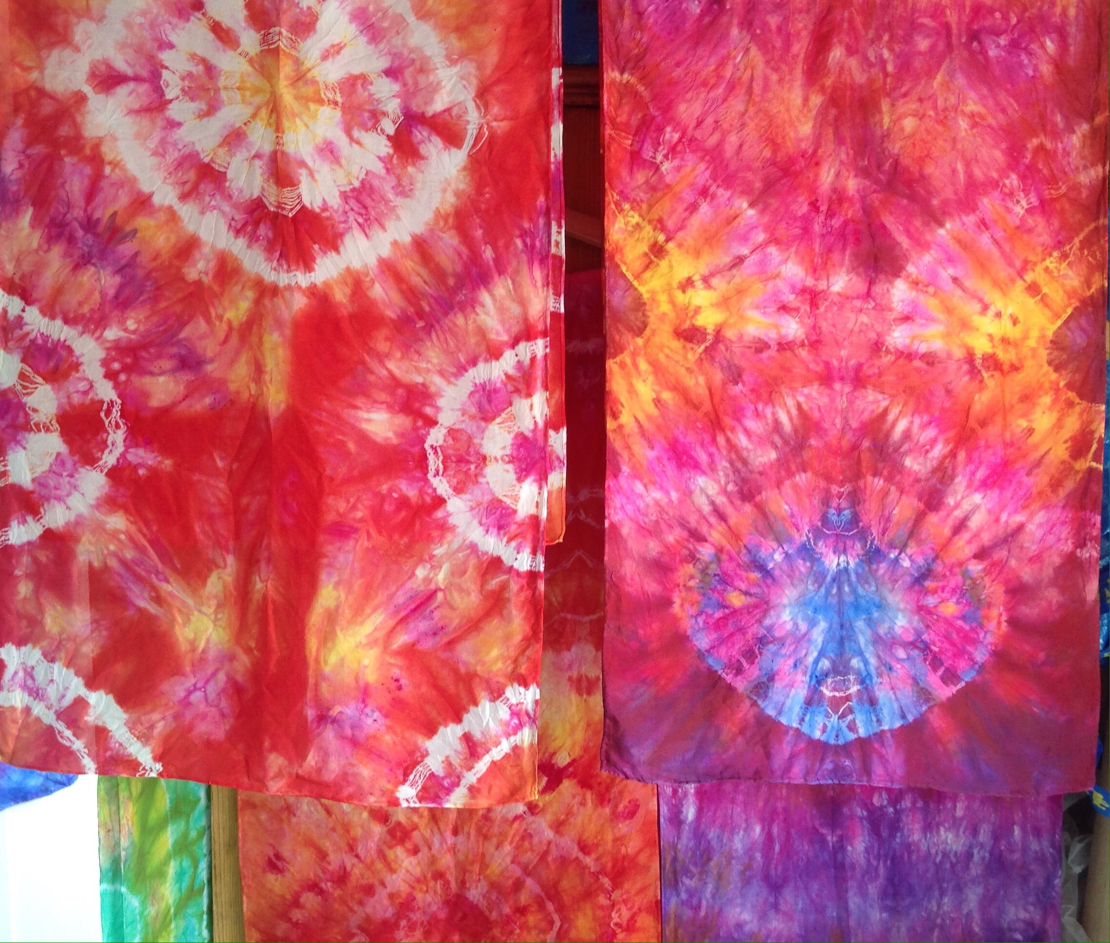 Tie dyed silk in wonderfully bright colours by Marina Elphick, batik artist and painter.