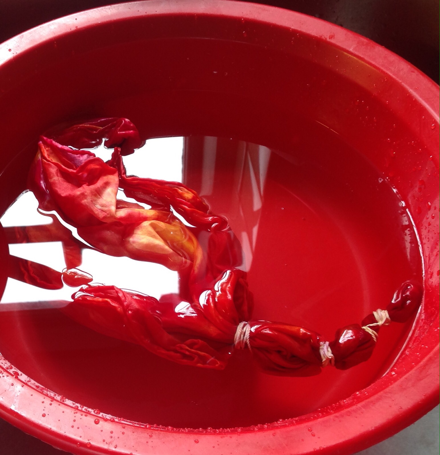 Silk scarf bound with elastic bands, soaking in a water and vinegar solution before dyeing.