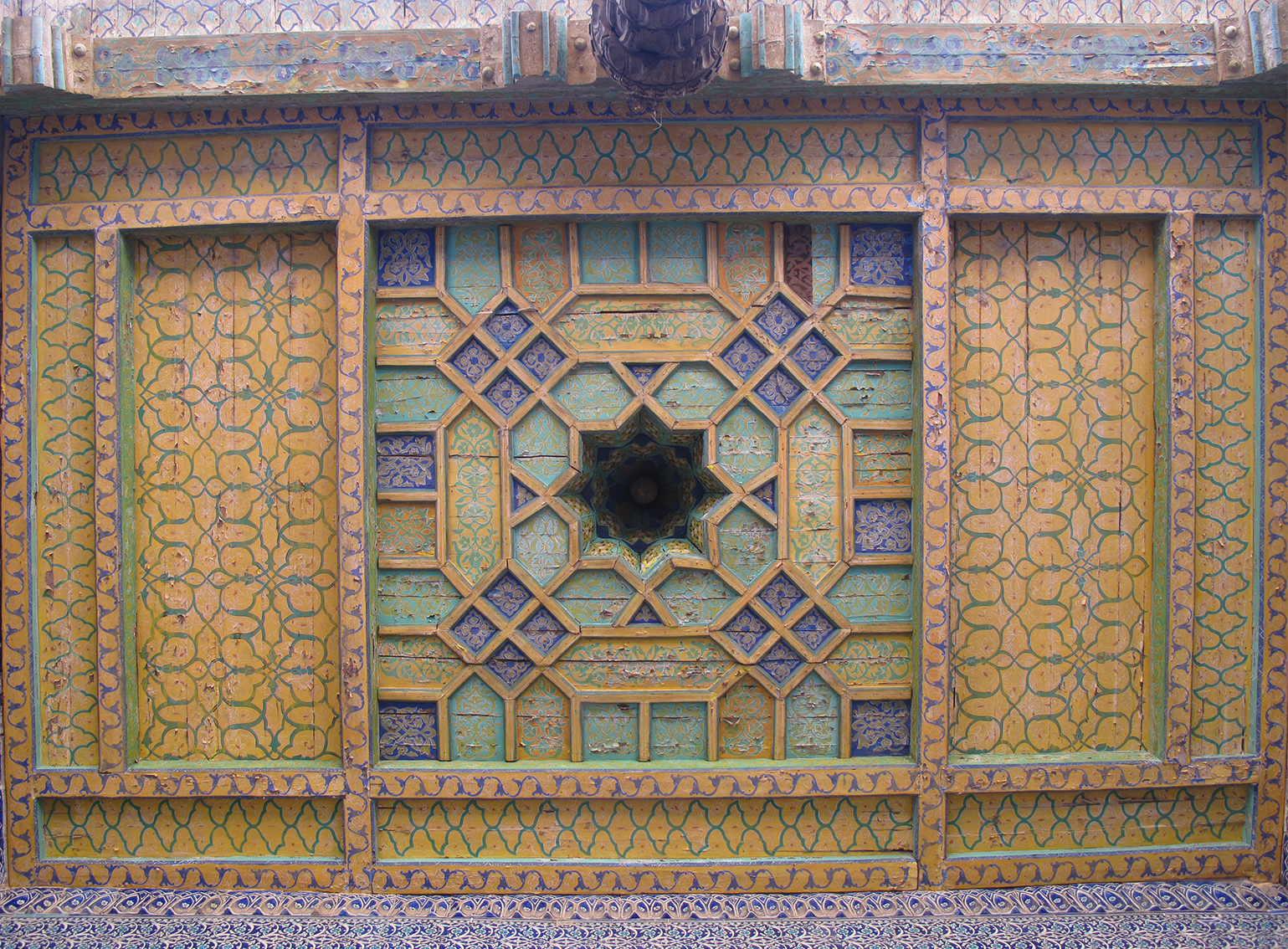 Yellow and blue Aivan ceiling at Tash-Hauli Harem, Khiva, Uzbekistan.