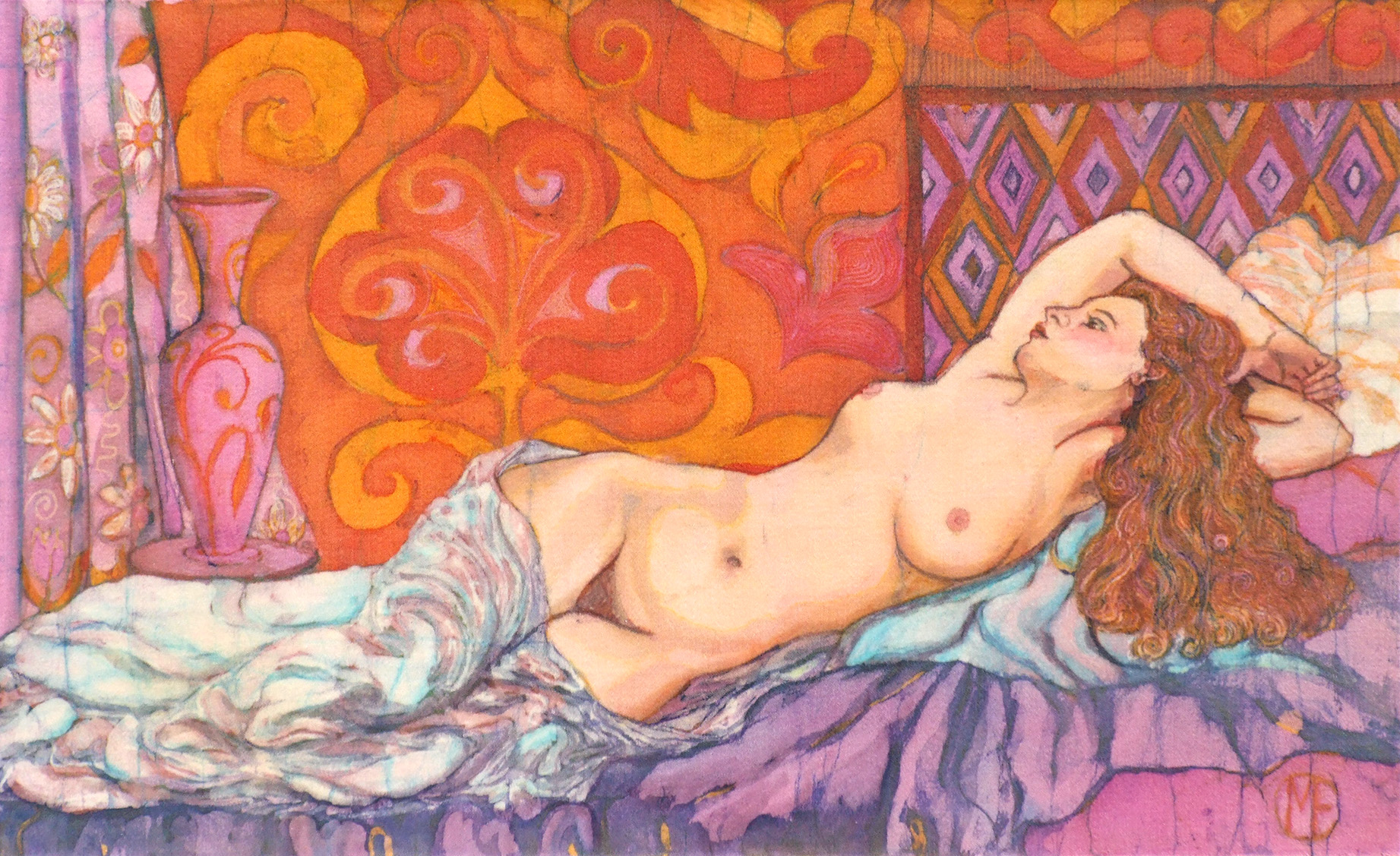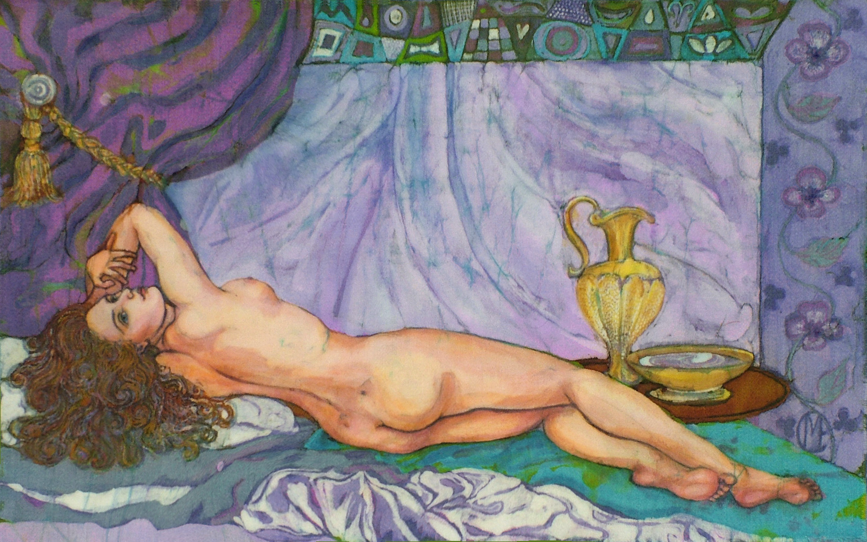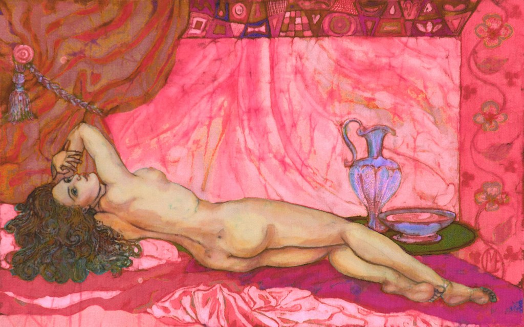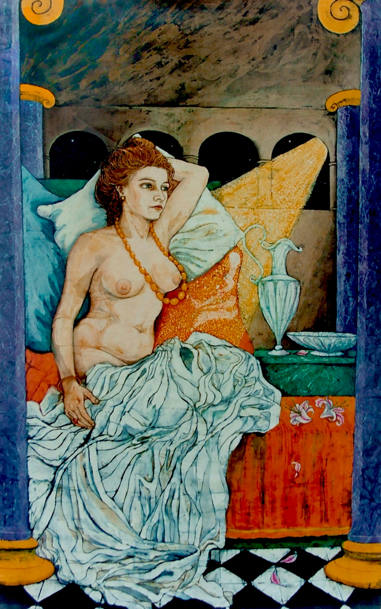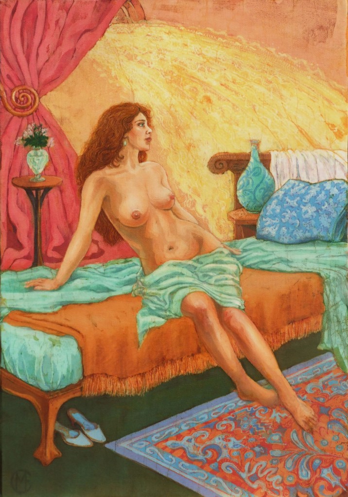 Boudoir, batik on cotton, 40cm x 58cm. Detail of Boudoir, batik.