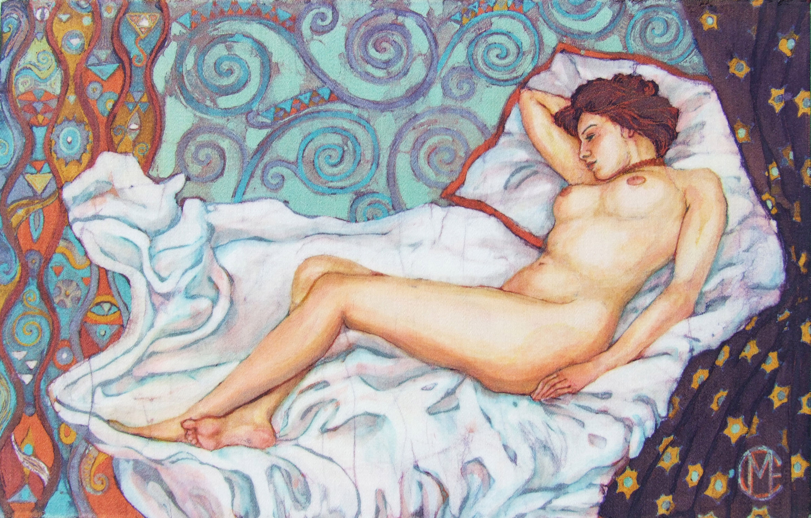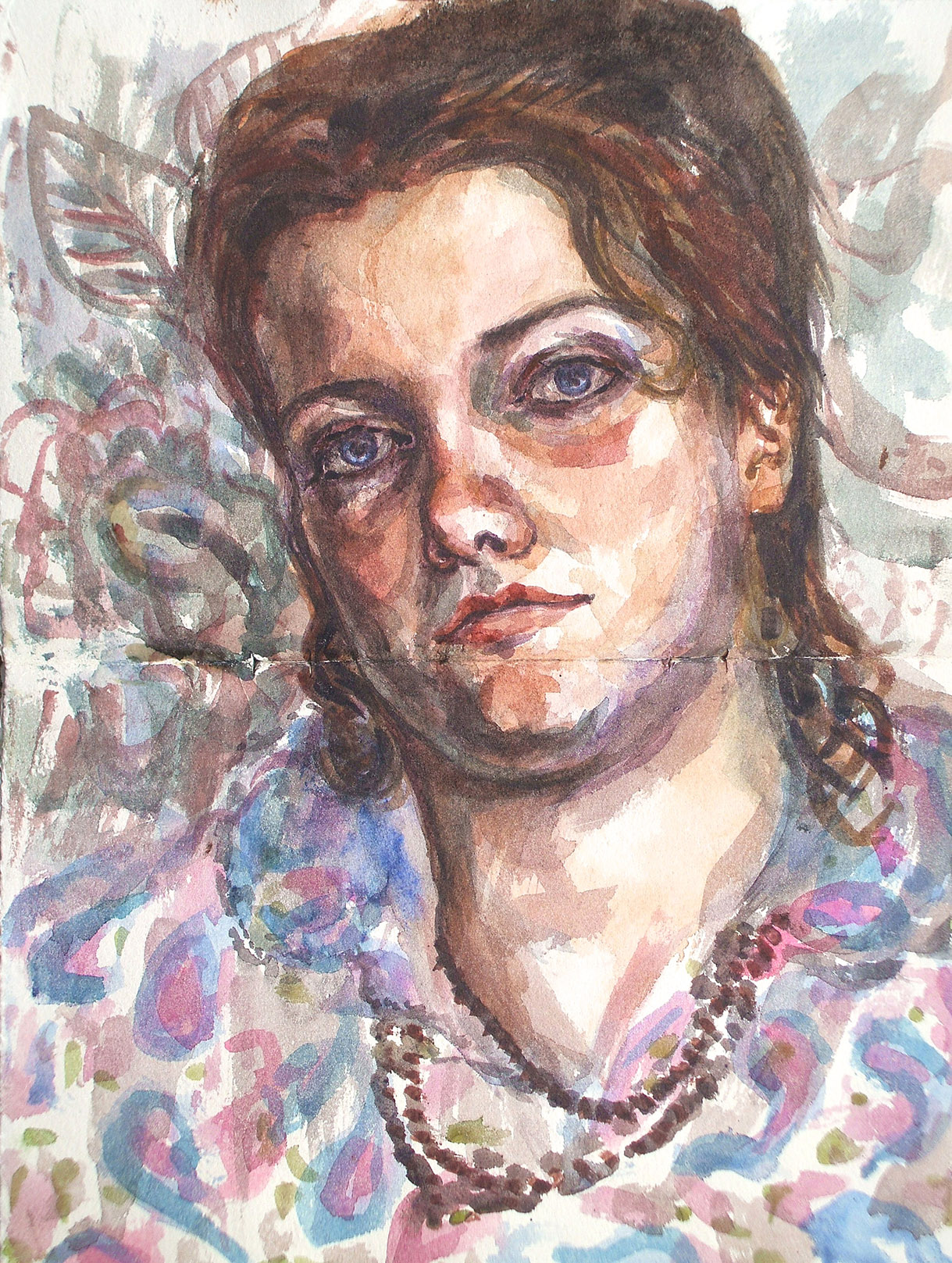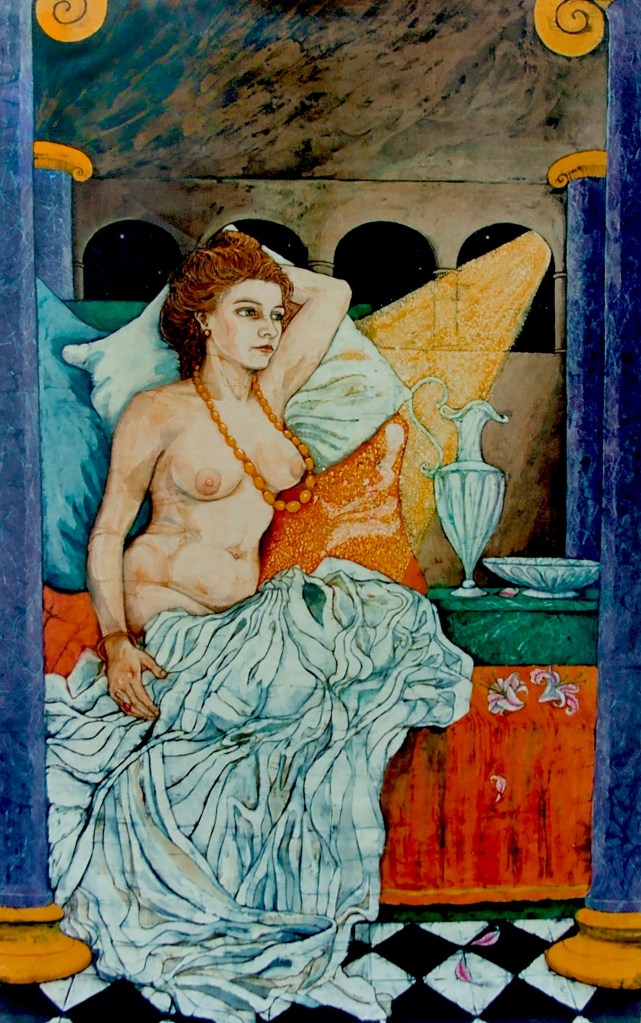 Study for Daphne, charcoal. Lillian study in paisley, sketch in watercolour for Daphne Batik.