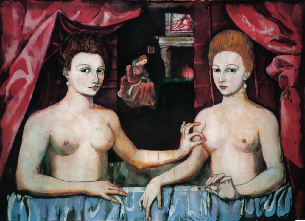 But what everybody sees first, what viewers can’t help but fix their gazes on, is the hand of the woman on the left as it pinches the nipple of the woman on the right, her index finger and thumb forming a perfect “C.” Above them, ruched silk curtains, heavy as thunderclouds, are parted as though the audience is at a stage’s edge. The viewer’s voyeuristic position sets the scene as a performance.