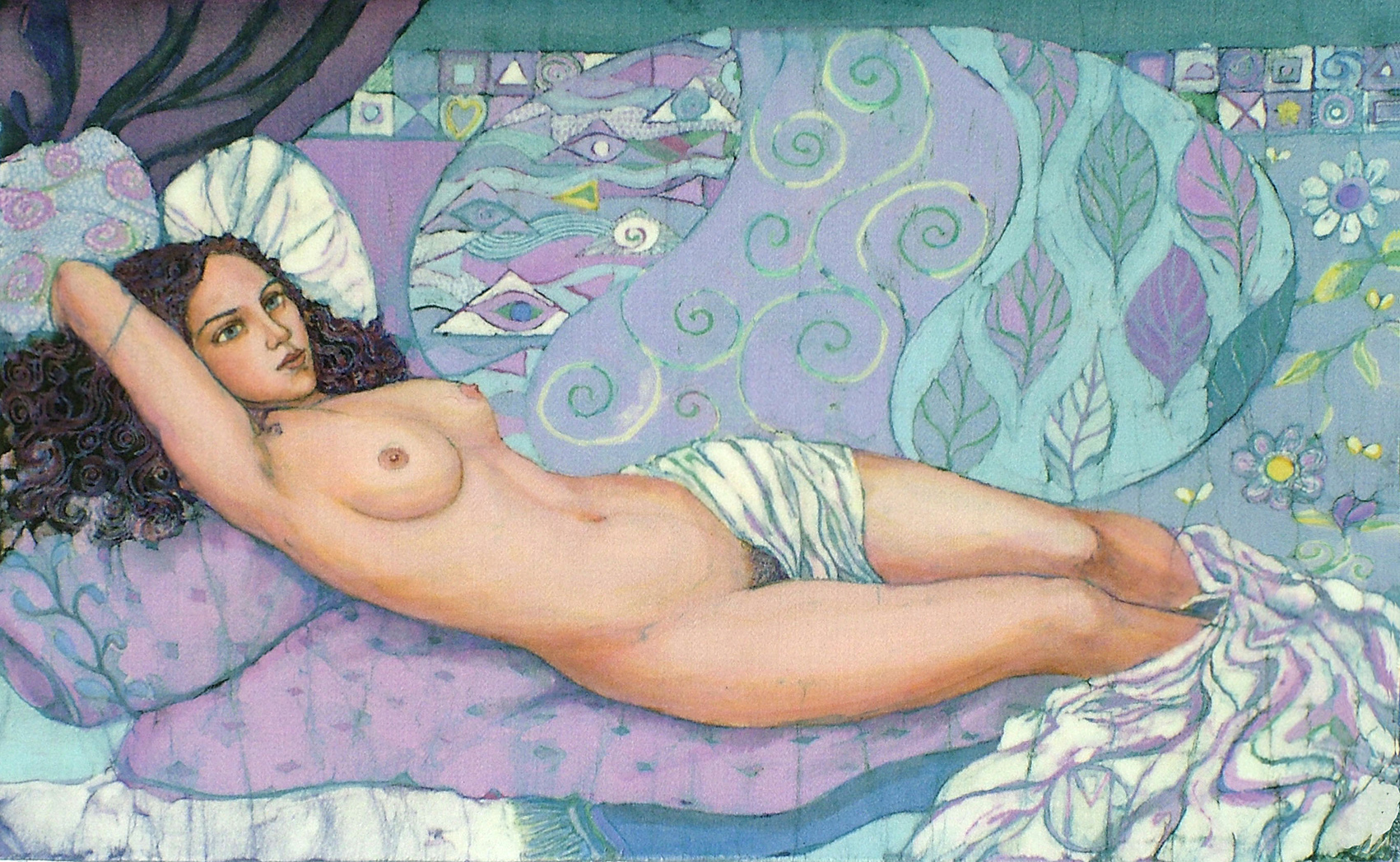 The excitement of blending life-like figures into an ornamental, decorative backgrounds inspired a more ambitious approach, soon I was batiking life-sized figures in large batik hangings.